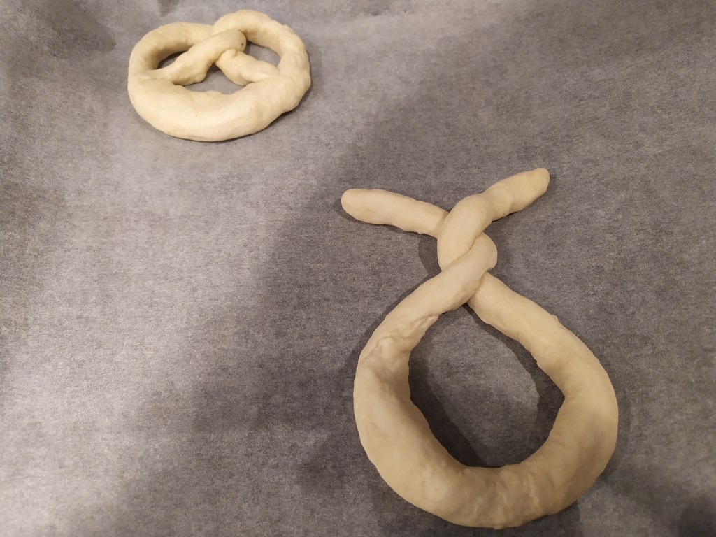 -dividimos la masa en 4-5 bolitas y cada una de ellas la estiramos hasta formar una tira alargada finita (un poquito más gruesa en la parte central) y le damos su forma característica (entrelazando los dos extremos y doblándolos sobre el centro). Los colocamos sobre el papel de horno un poco enharinado para que luego no se peguen. Si los dejamos reposar, vuelven a crecer
