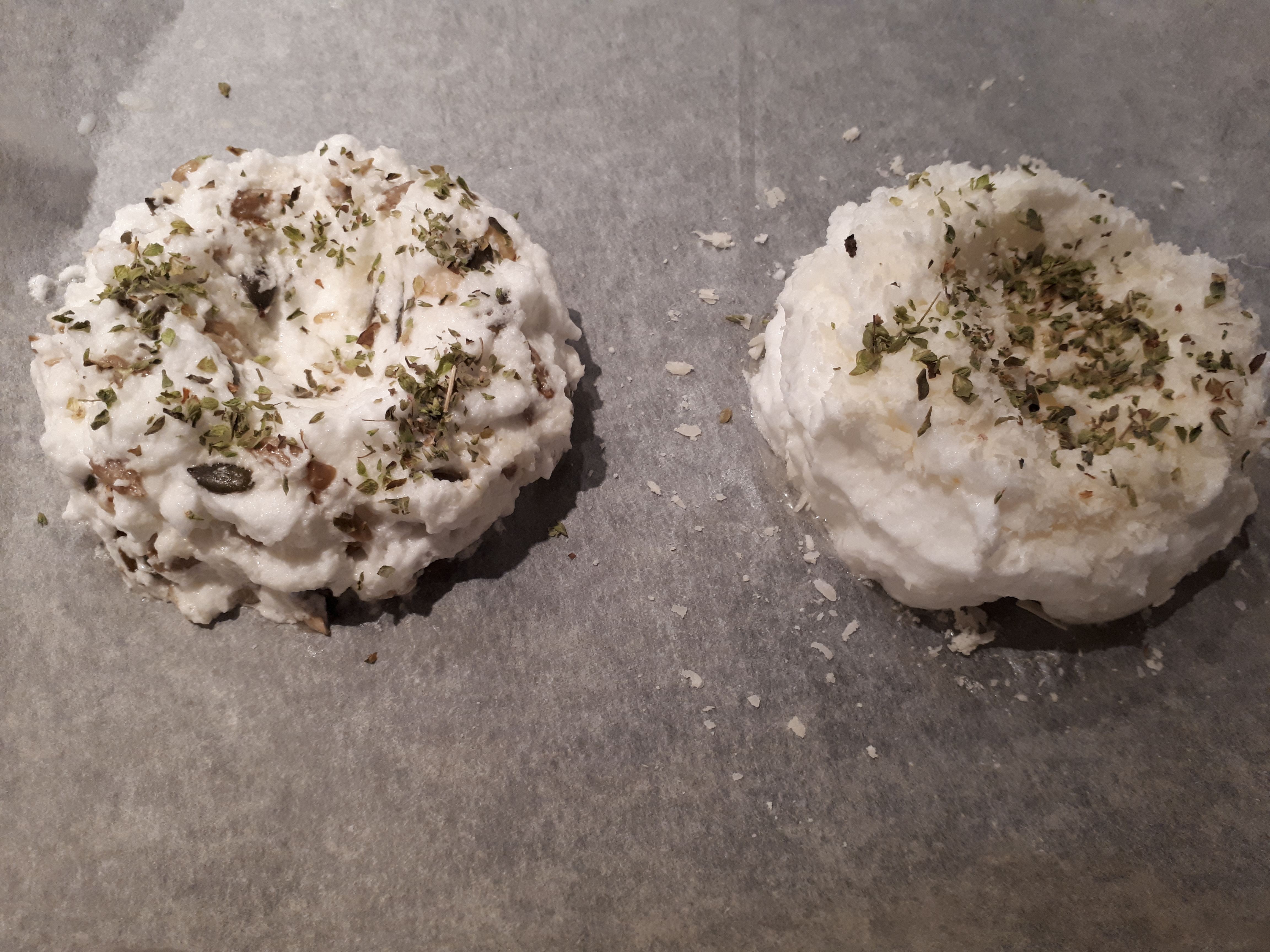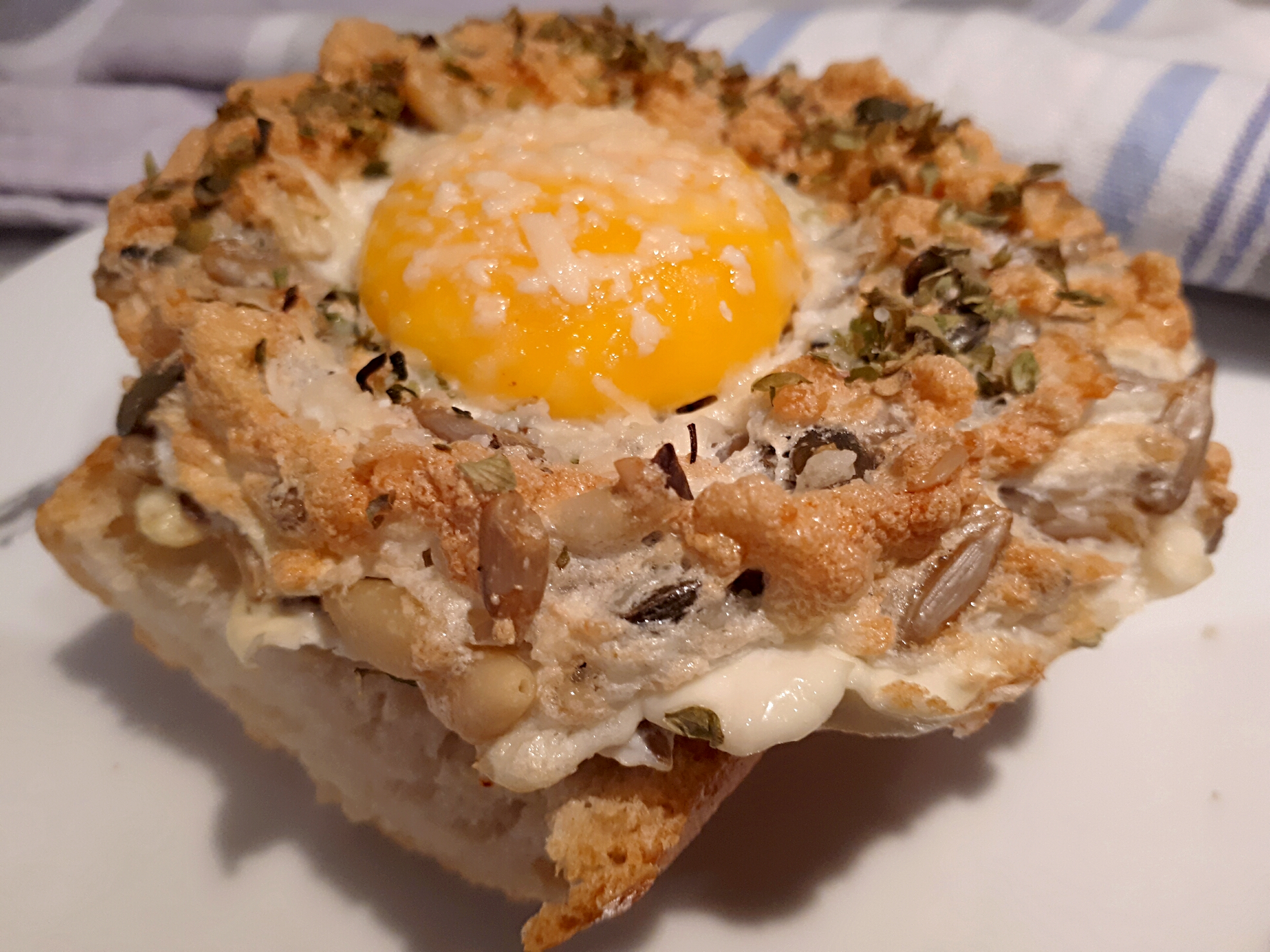 -batimos la clara a punto de nieve con unas varillas y la colocamos con una cuchara en un cuenco de cerámica o directamente en un papel de horno y la aliñamos con sal, orégano y mozzarella rallada o queso parmesano (también podemos añadirle pipas o mezcla de semillas). En el centro hacemos un hueco para añadir la yema después