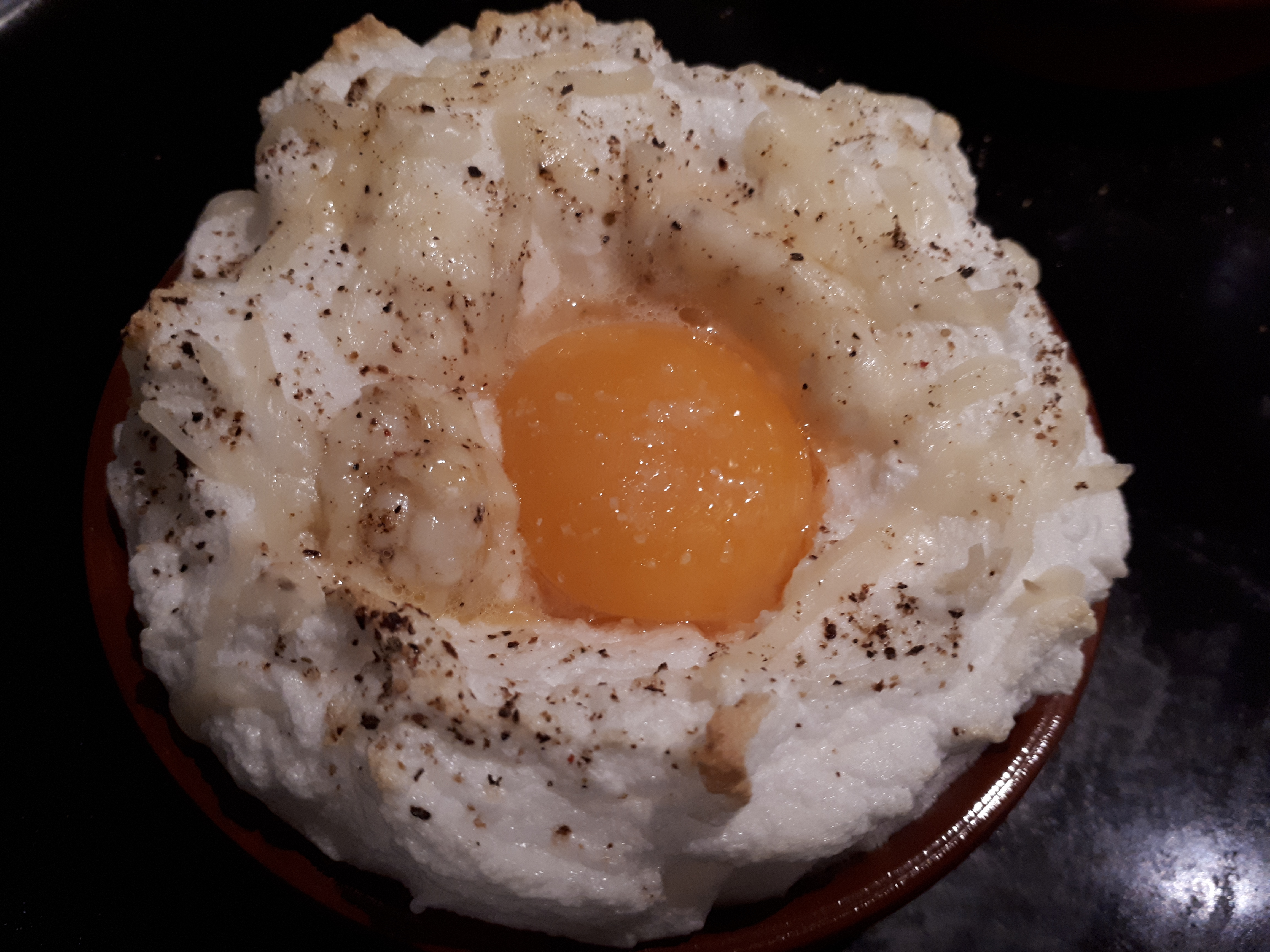 -la sacamos del horno y añadimos la yema en el centro, a la que añadimos un poco de sal y más queso
