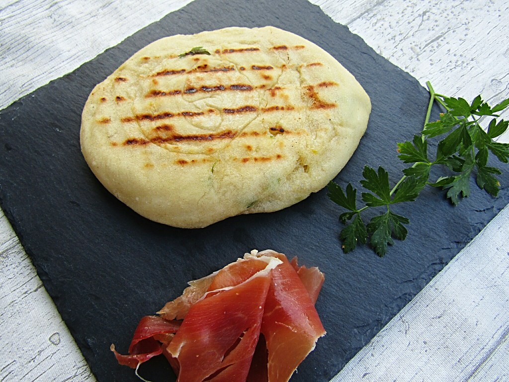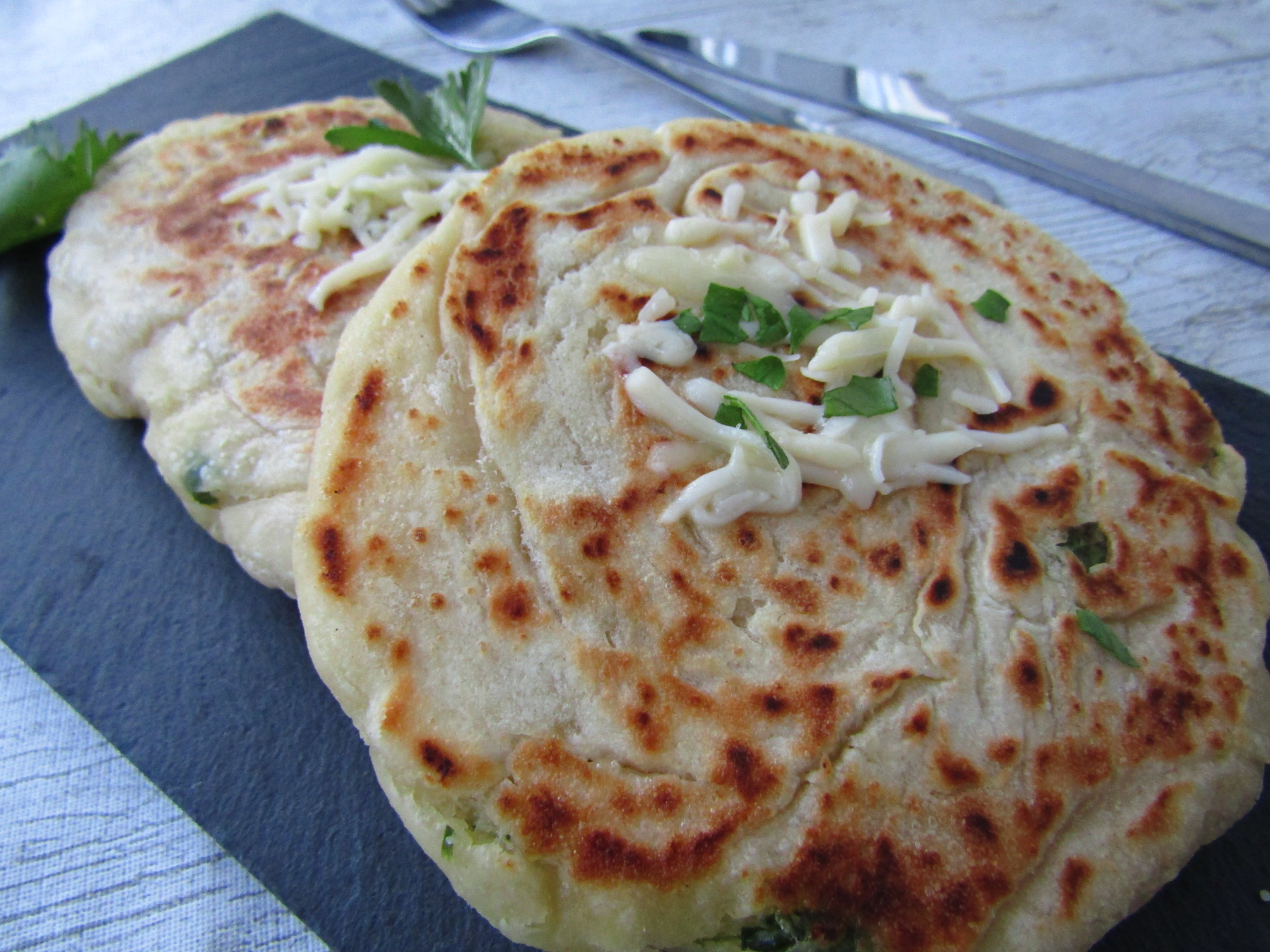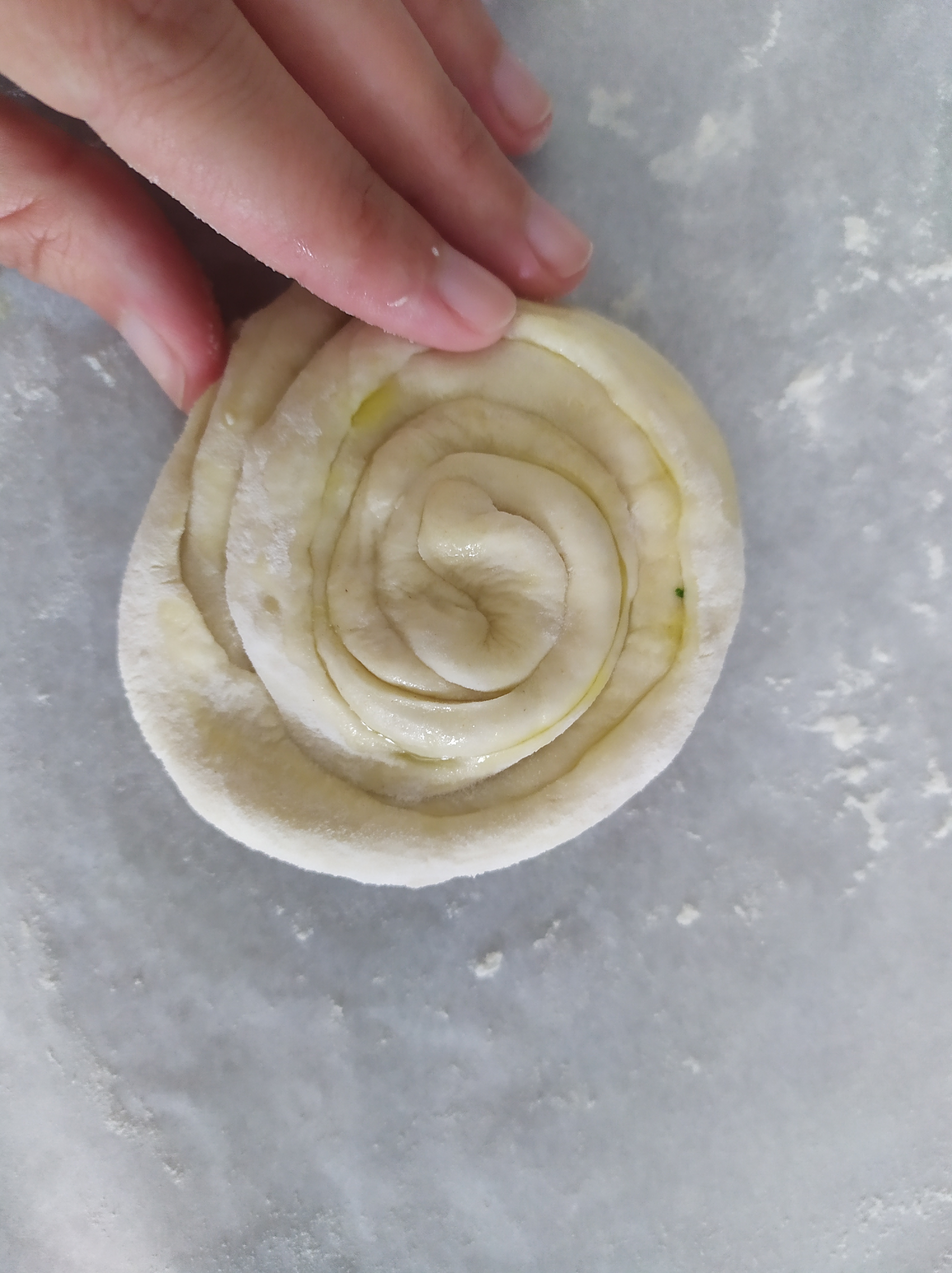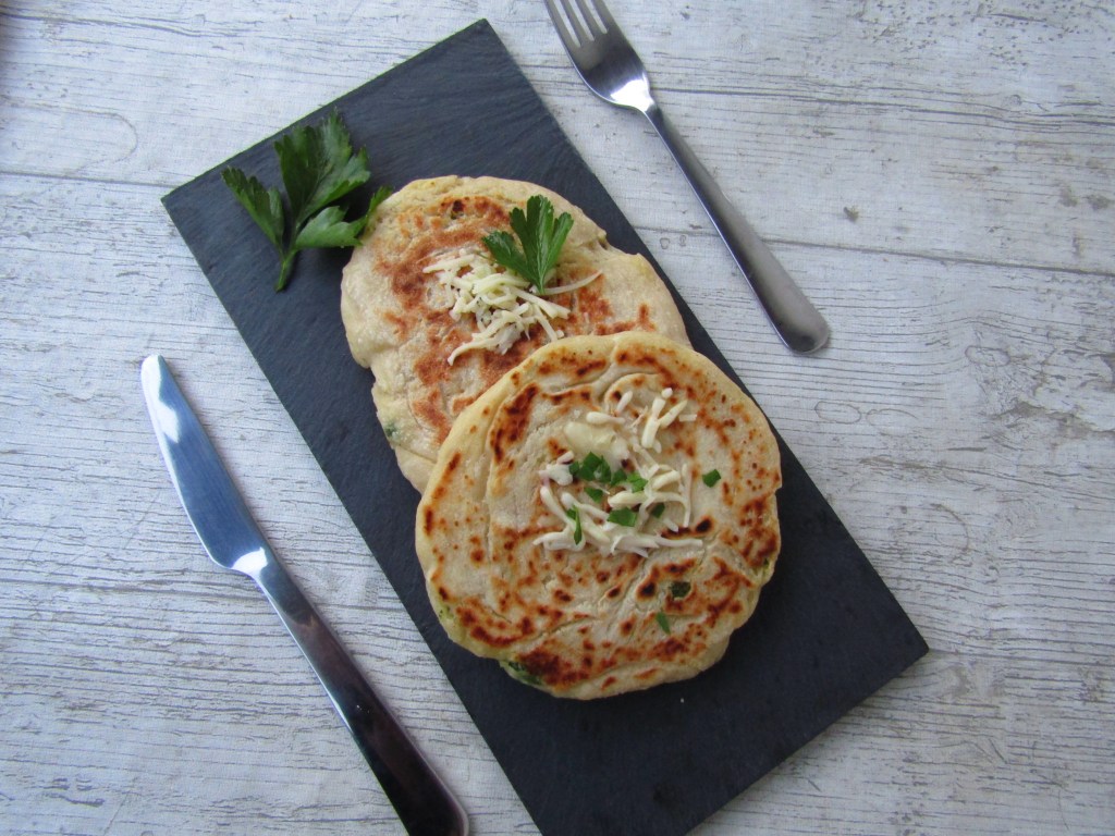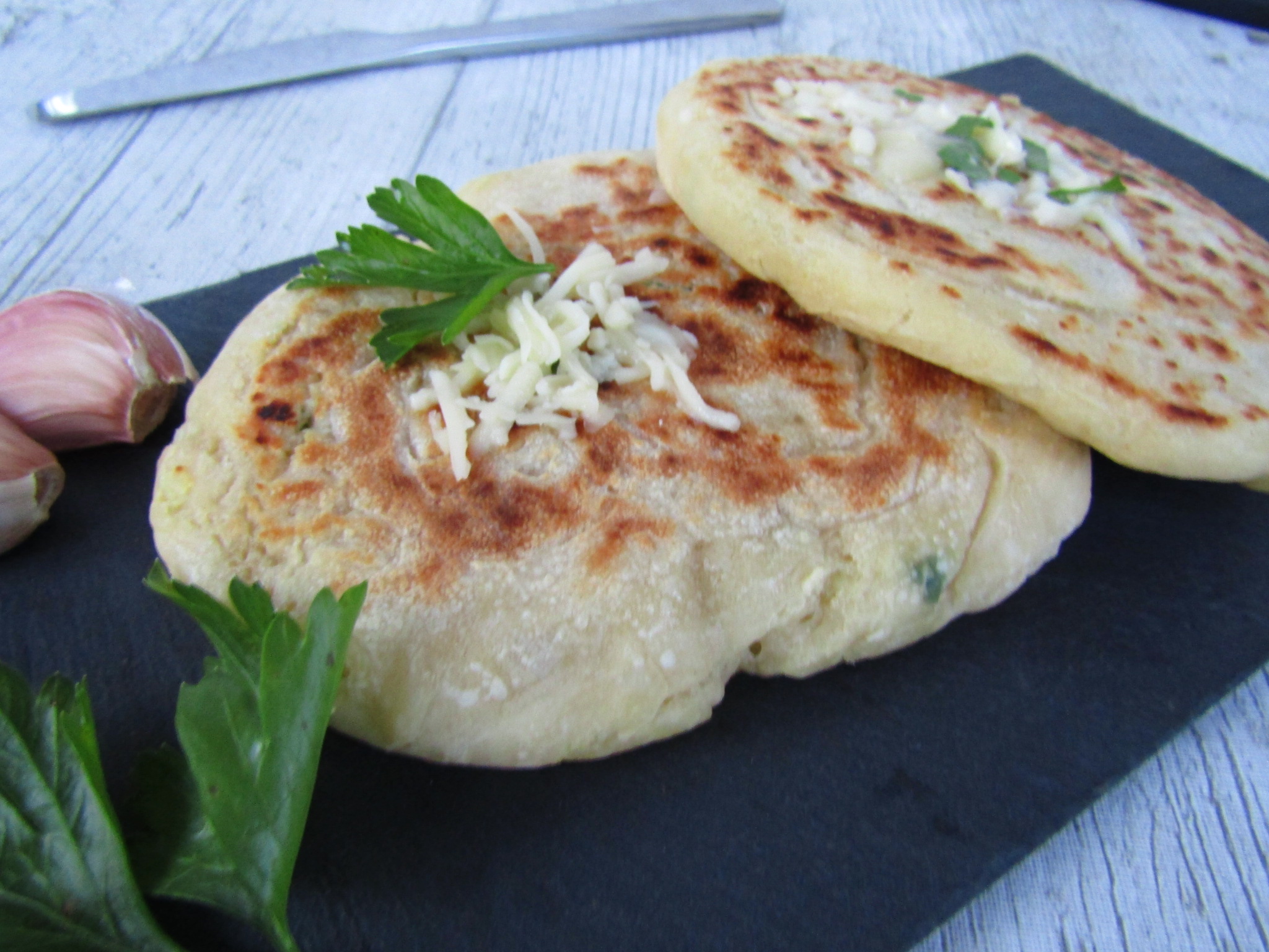 Me encanta hacer el pan en casa y especialmente a la sartén. Disfruto muchísimo al comerlo recién hecho para desayunar, que le pones una loncha de queso encima y se funde… Esta vez he querido prepararlo diferente y he optado por hacerlo de ajo y perejil. Queda súper sabroso y buenísimo. He hecho bolitas, que he estirado para rellenarlas con la mezcla de ajo picado mezclado con acite y unas hojitas de perejil y luego las he enrollado en forma de espiral. Le hemos añadido un poco de queso rallado a uno, pero también se puede acompañar con embutido o con alguna salsa que hagáis. Con estas cantidades salen 6 bollitos a la sartén.