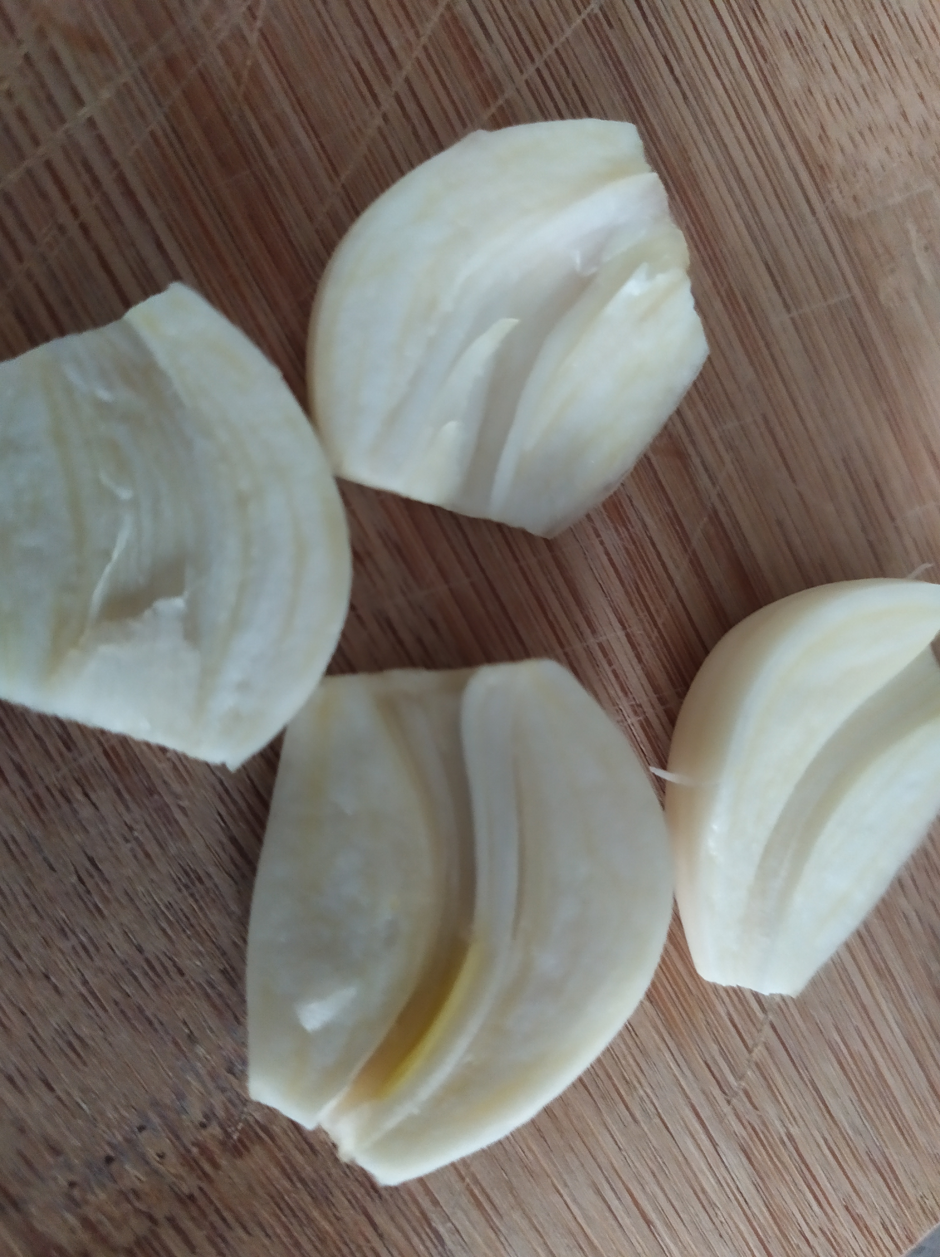 -mientras, preparamos el relleno. Para ello, empezamos pelando los ajos, les quitamos el centro y los troceamos