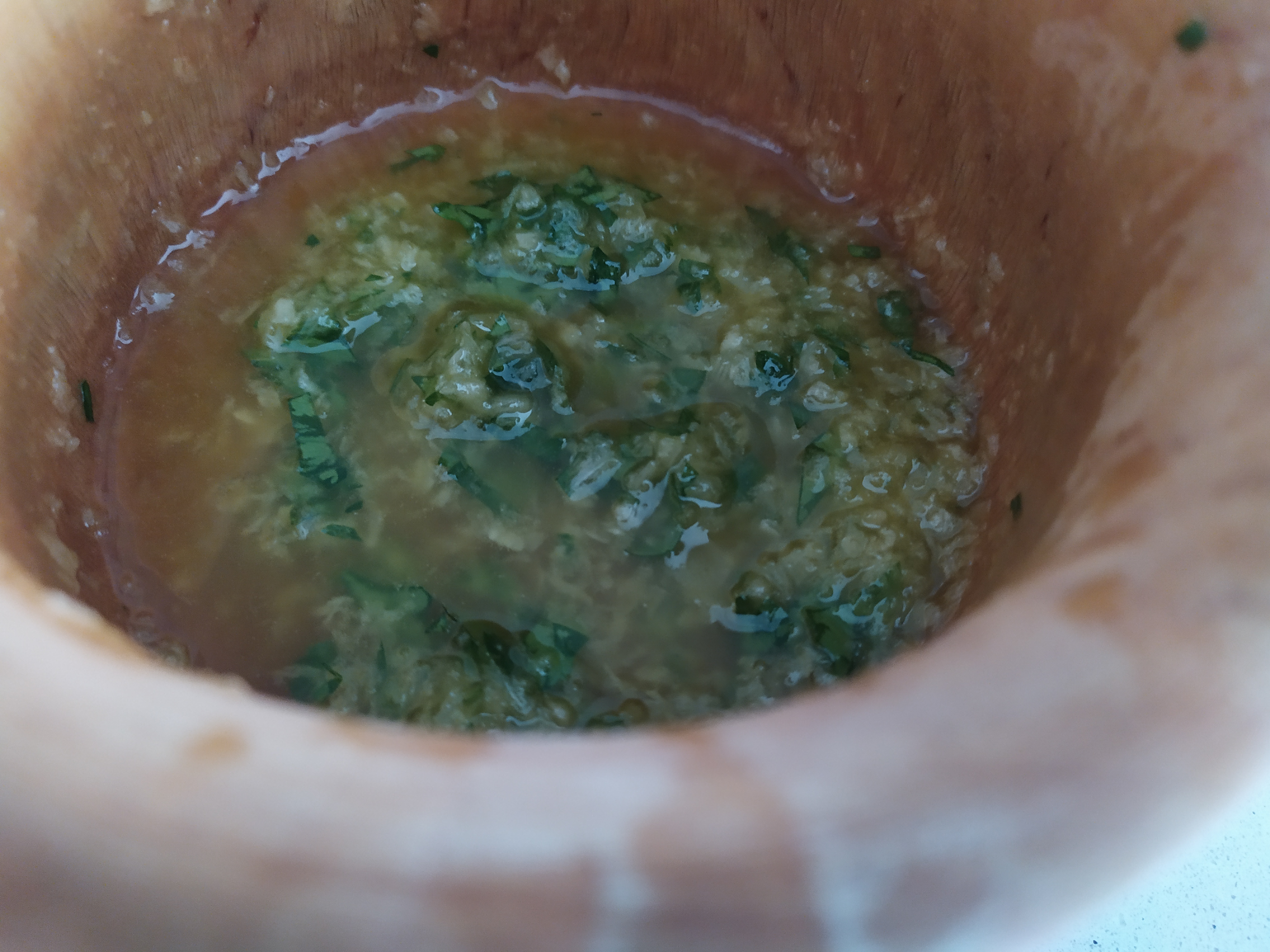 -los colocamos en el mortero junto con el aceite y unas hojitas de perejil troceadas y machacamos bien