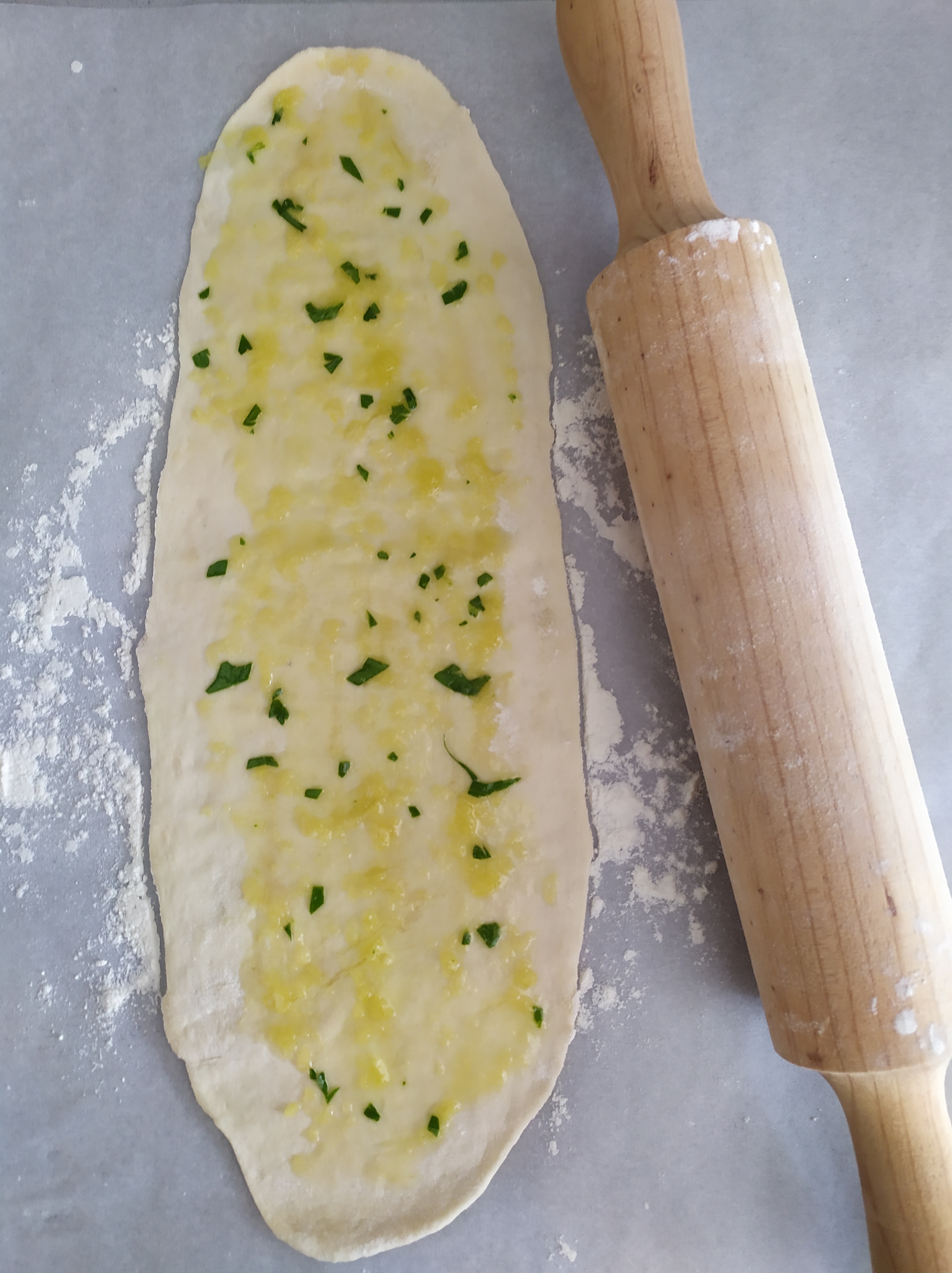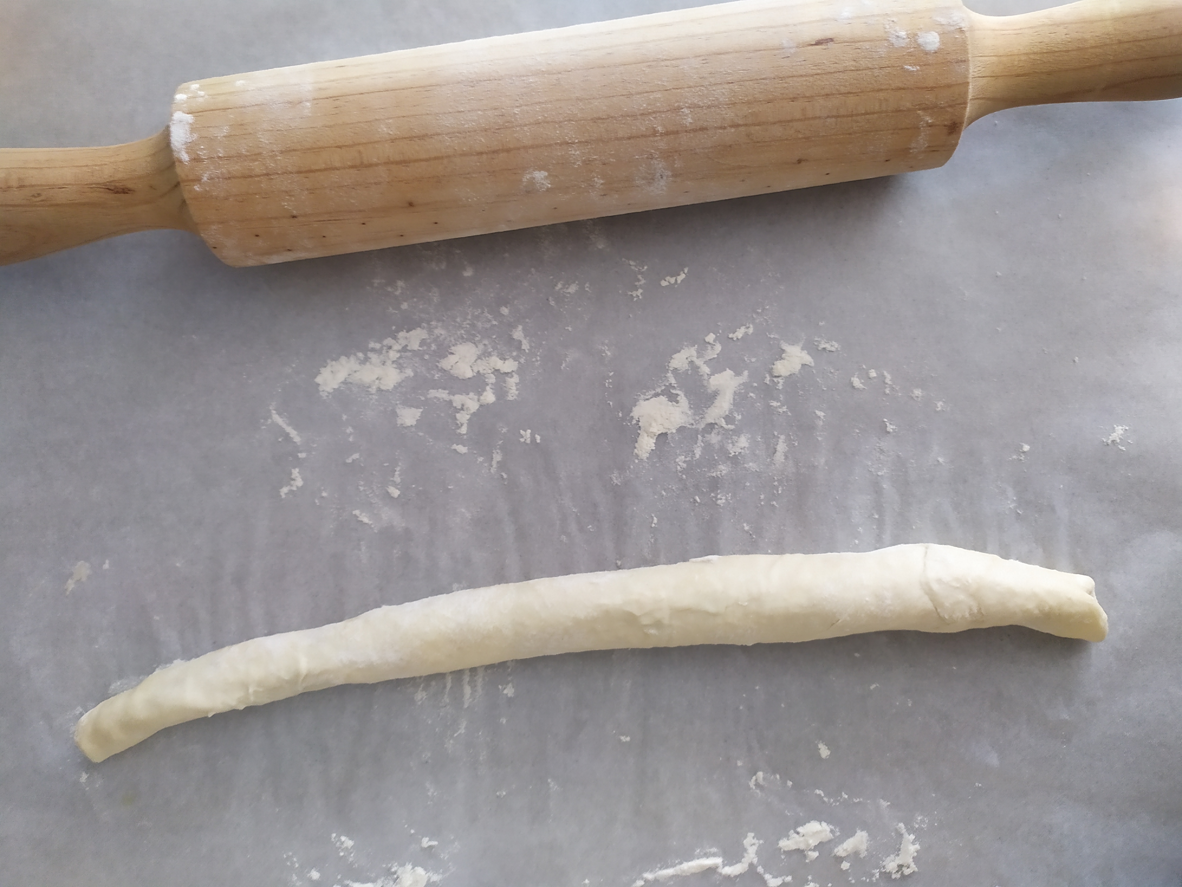 -con la ayuda de un rodillo, estiramos cada bola encima de una superficie enharinada y le damos forma alargada, la dejamos bien finita