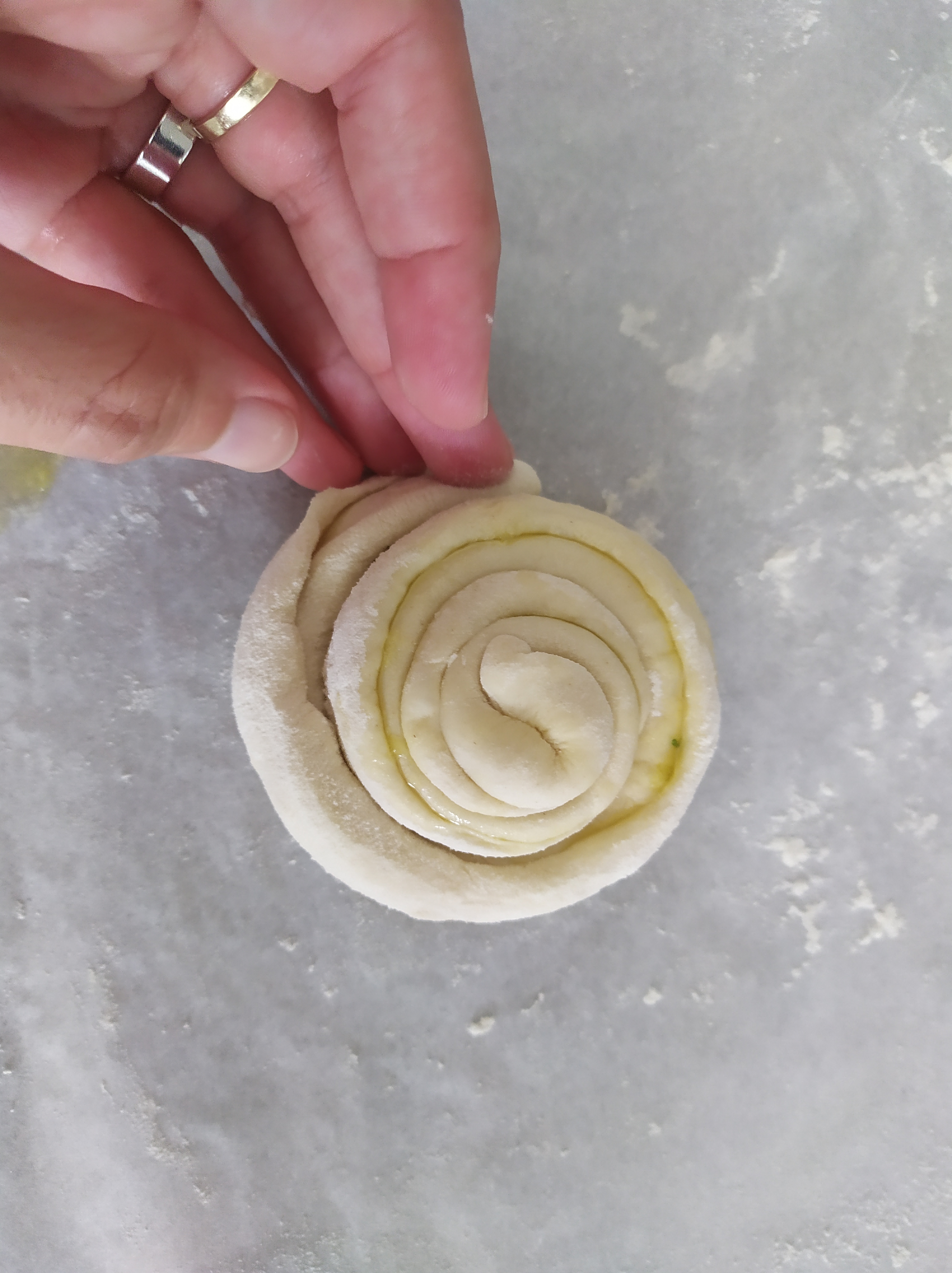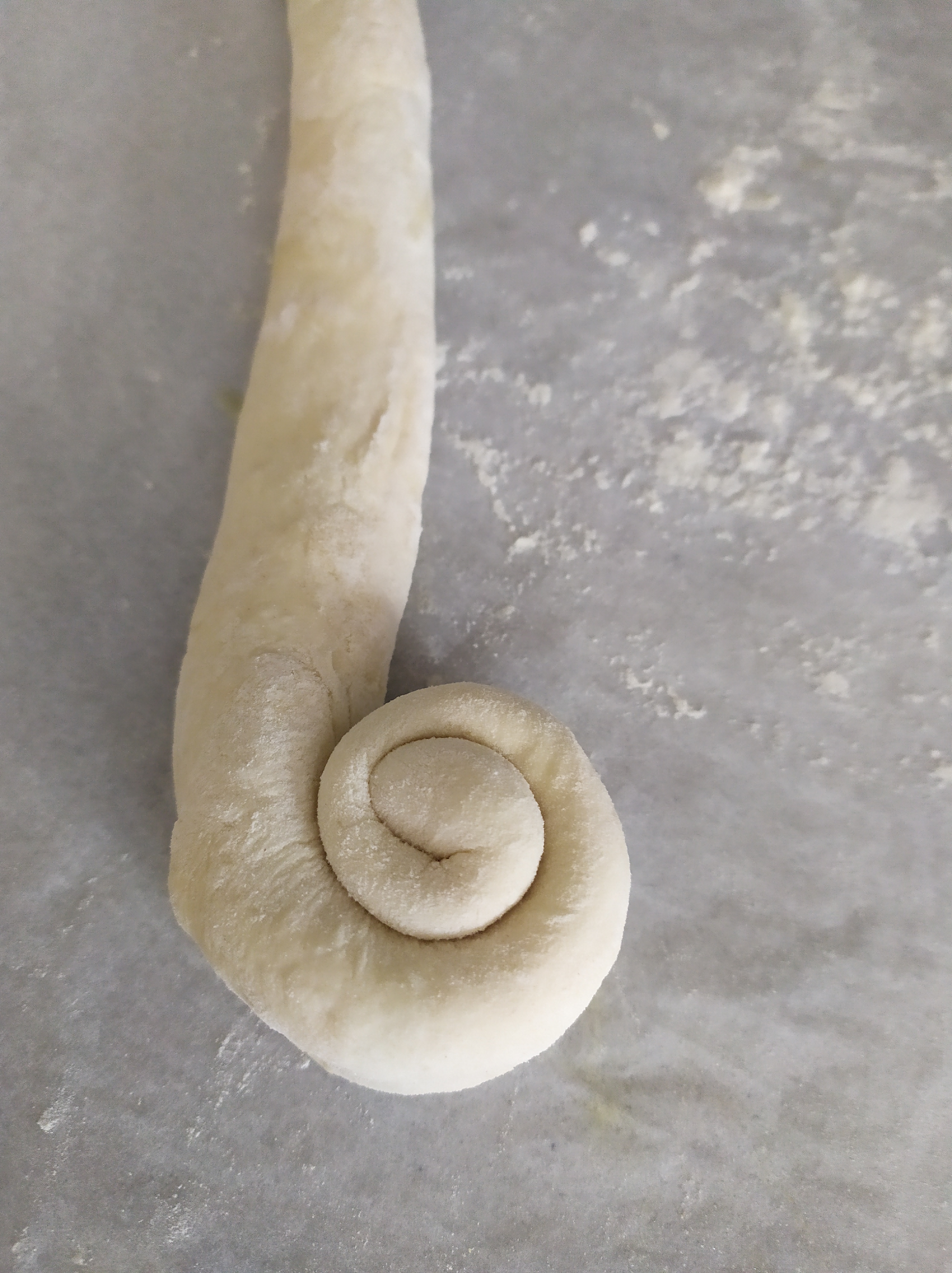 -estiramos un poco el rulo con la mano para que sea más largo y luego lo enrollamos sobre si mismo en forma de caracol