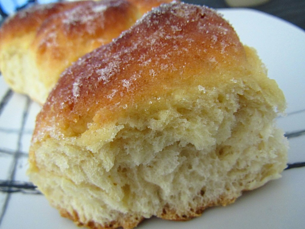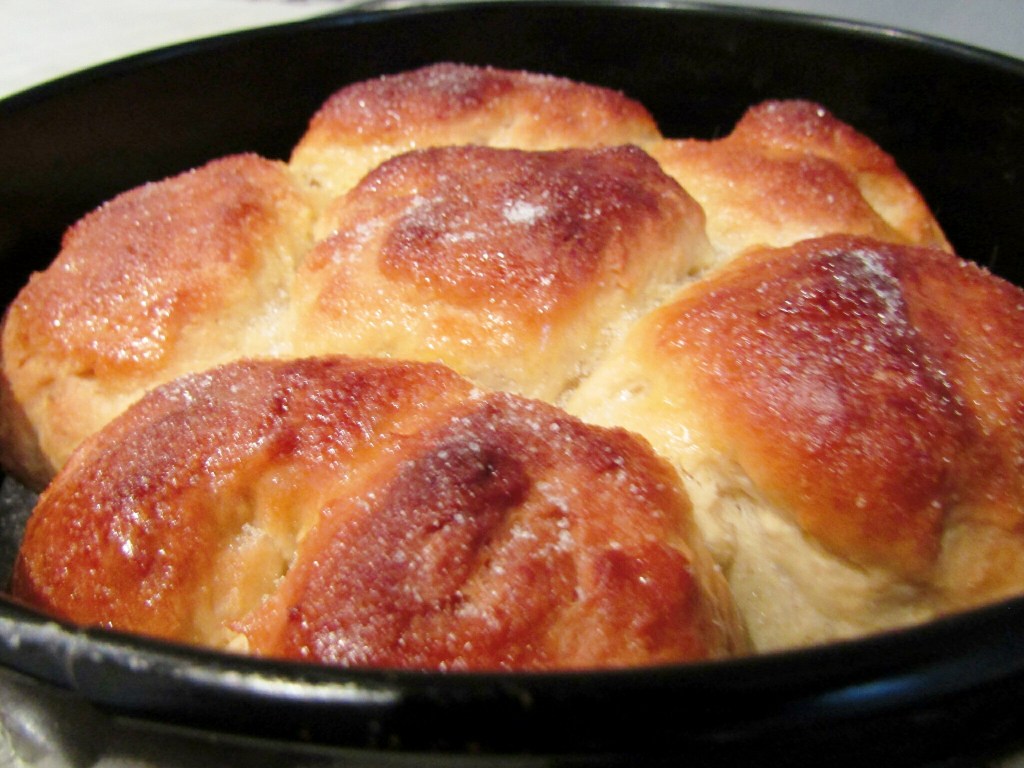 Como algunos de vosotros ya sabéis, en casa nos gusta preparar el pan y comerlo recién hecho por la mañana para desayunar o alguna noche para cenar con embutido. Rafa lo prefiere al horno y yo a la sartén, así que hacemos porciones de la masa y cada uno lo prepara como quiere. Nuestro preferido es con olivas, pero para variar esta vez he querido hacer un pan dulce. Lo he colocado en un molde redondo desmoldable en bollitos individuales uno al lado del otro, que al dejarlos reposar más luego el tiempo de horneado, crecen y forman un bollo generoso (esponjoso, tierno, sabroso…).