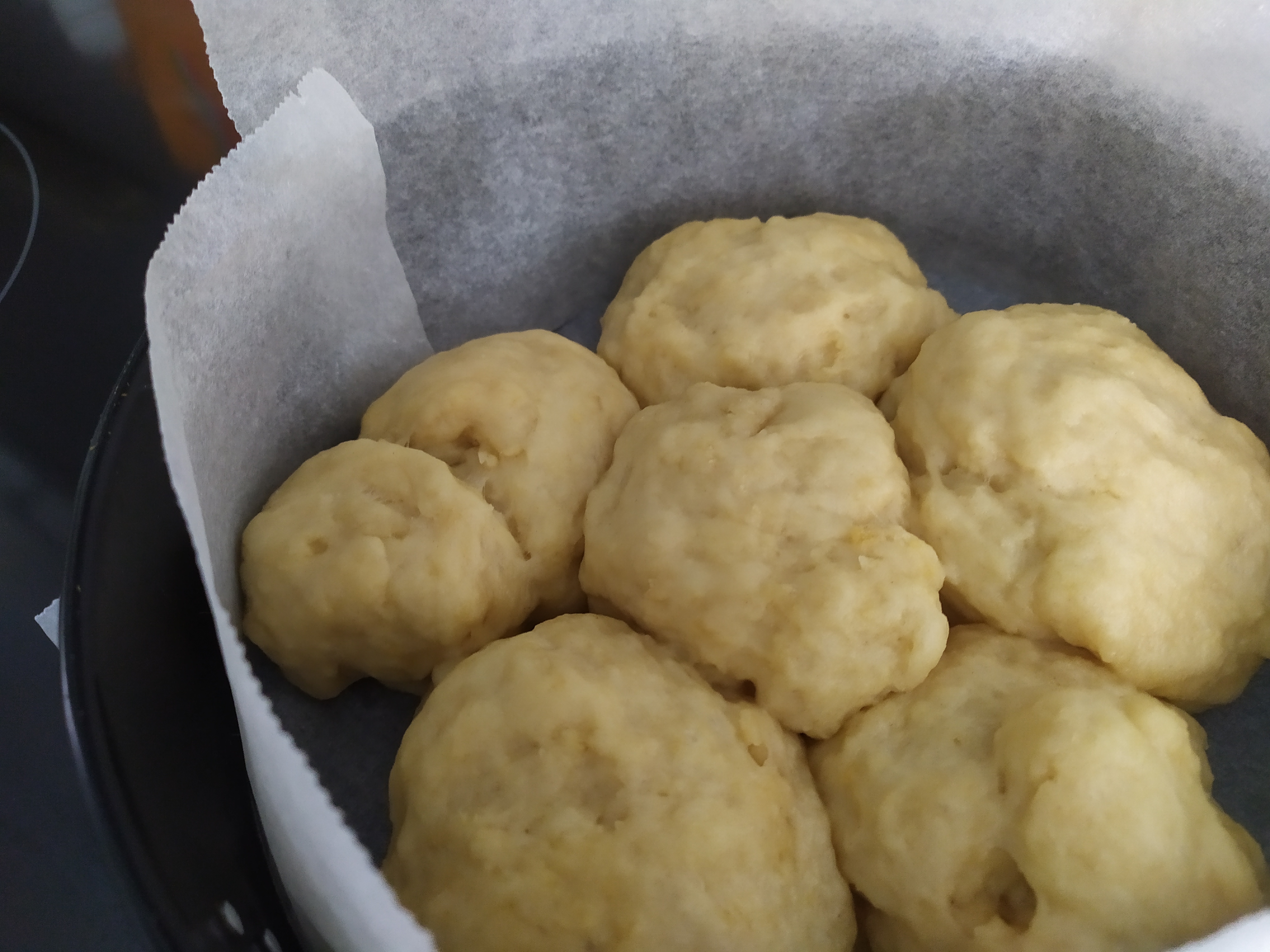 -dividimos la masa en bollitos individuales y los colocamos uno al lado del otro en un molde desmoldable (podéis hacer bollitos individuales o un bollo grande, como os guste más)
