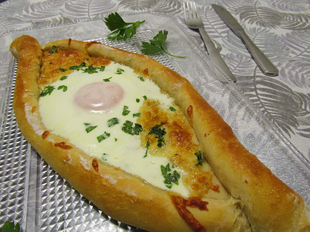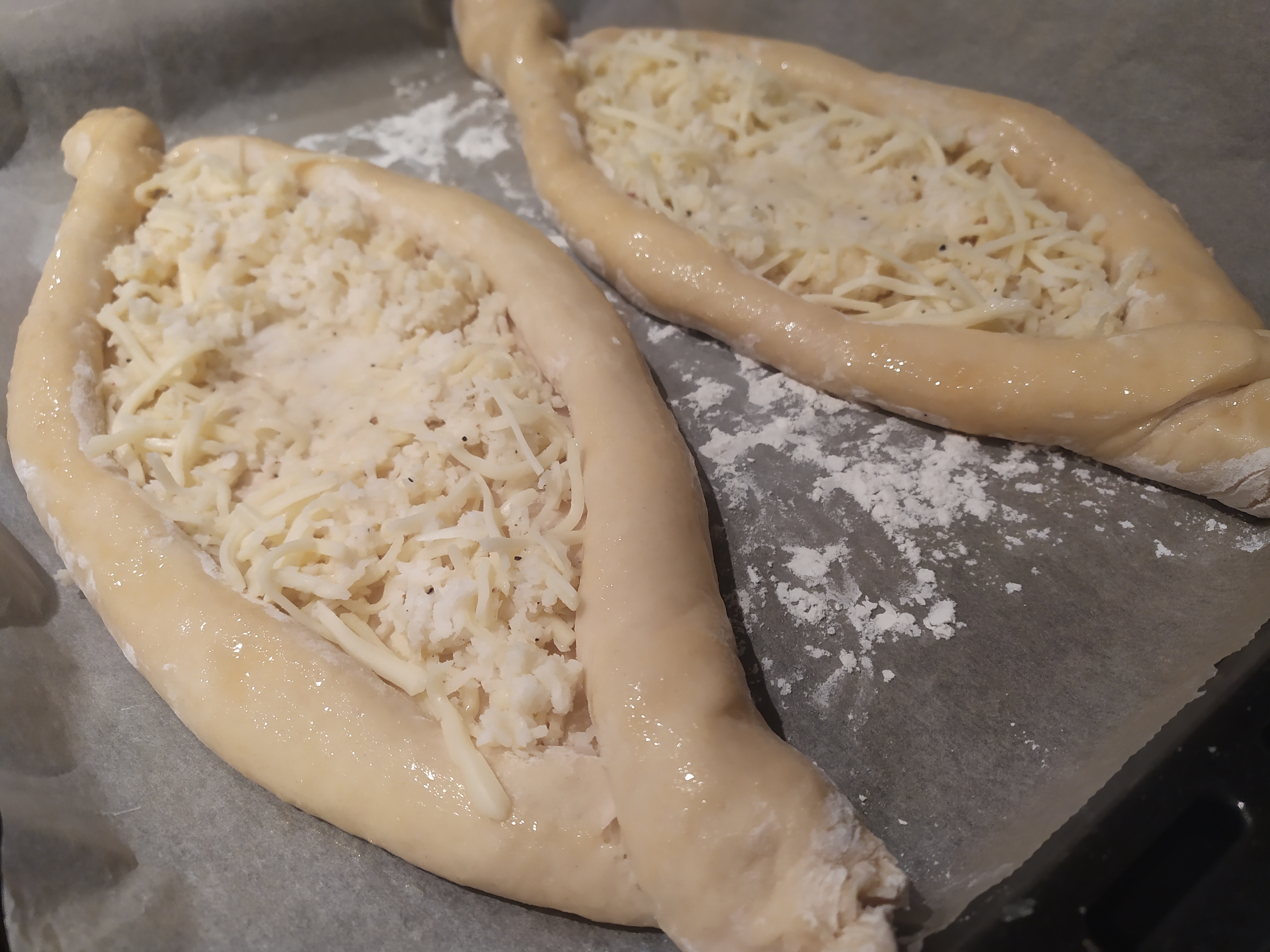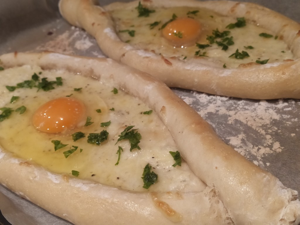 Chafardeando por Instagram vi esta receta que me llamó mucho la atención y la guardé. He estado buscando por Internet y se trata de un pan elaborado con leche que se rellena de queso y es típico de Georgia, que se llama Khachapuri. Ha sido todo un reto, ya que no sabía el resultado que obtendría, tenía dudas sobre la forma (si se podría trabajar, mantener firme y no se saldría el relleno), el sabor (si no sería muy empalagoso al llevar solo queso)… Pero ha sido más fácil de lo que me pensaba y tanto la elaboración como el resultado nos ha sorprendido. La masa se trabaja muy bien y aguanta bien la forma y el relleno es sabroso. Podéis utilizar vuestros quesos preferidos, nosotros hemos mezclado mozzarella rallada y una cuña de queso de cabra, que hemos rallado. Lo hemos aliñado con un poco de pimienta y le hemos añadido perejil picado junto al huevo. Si os gusta sucar el huevo, podéis hacerlo con los bordes de la masa y hornearlo durante pocos minutos para que no se cuaje, eso va a gustos. Además, hemos pintado los bordes con huevo batido y le da un toque muy especial.