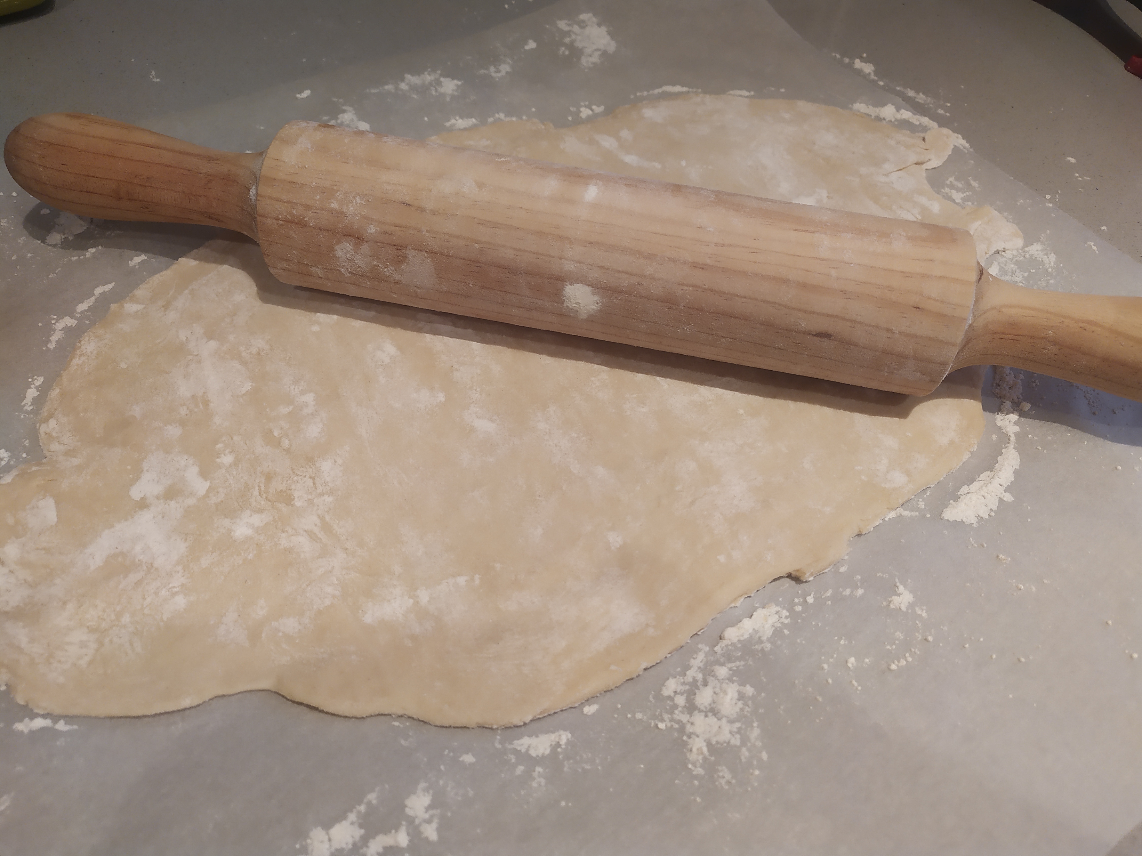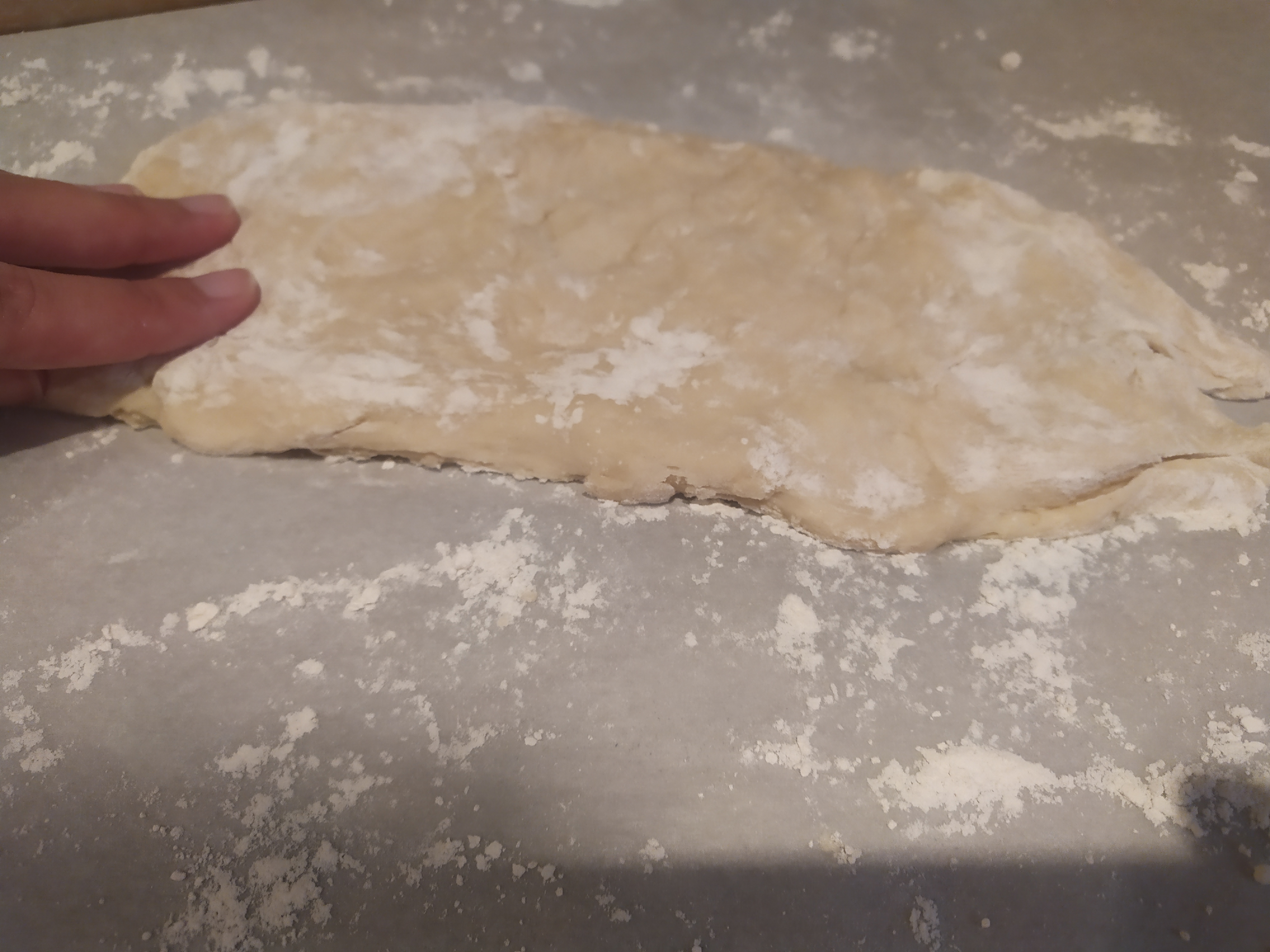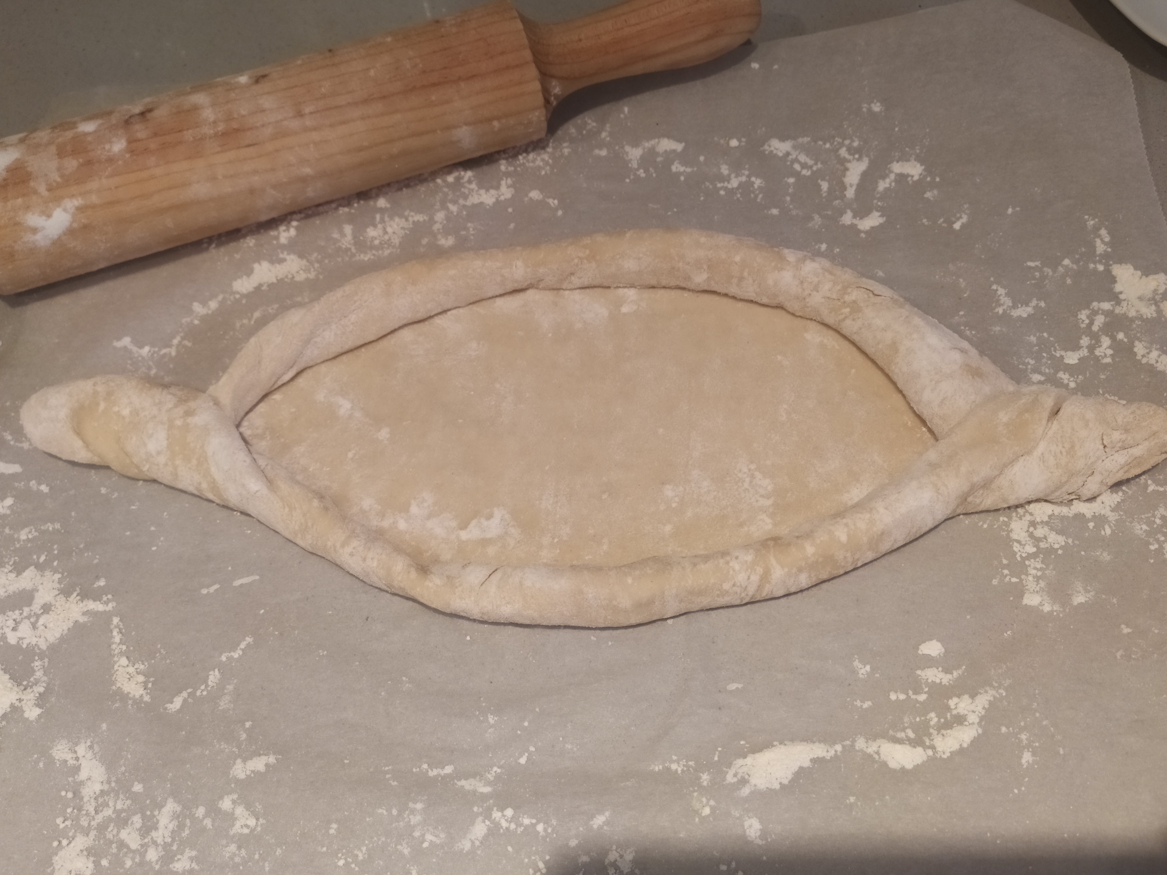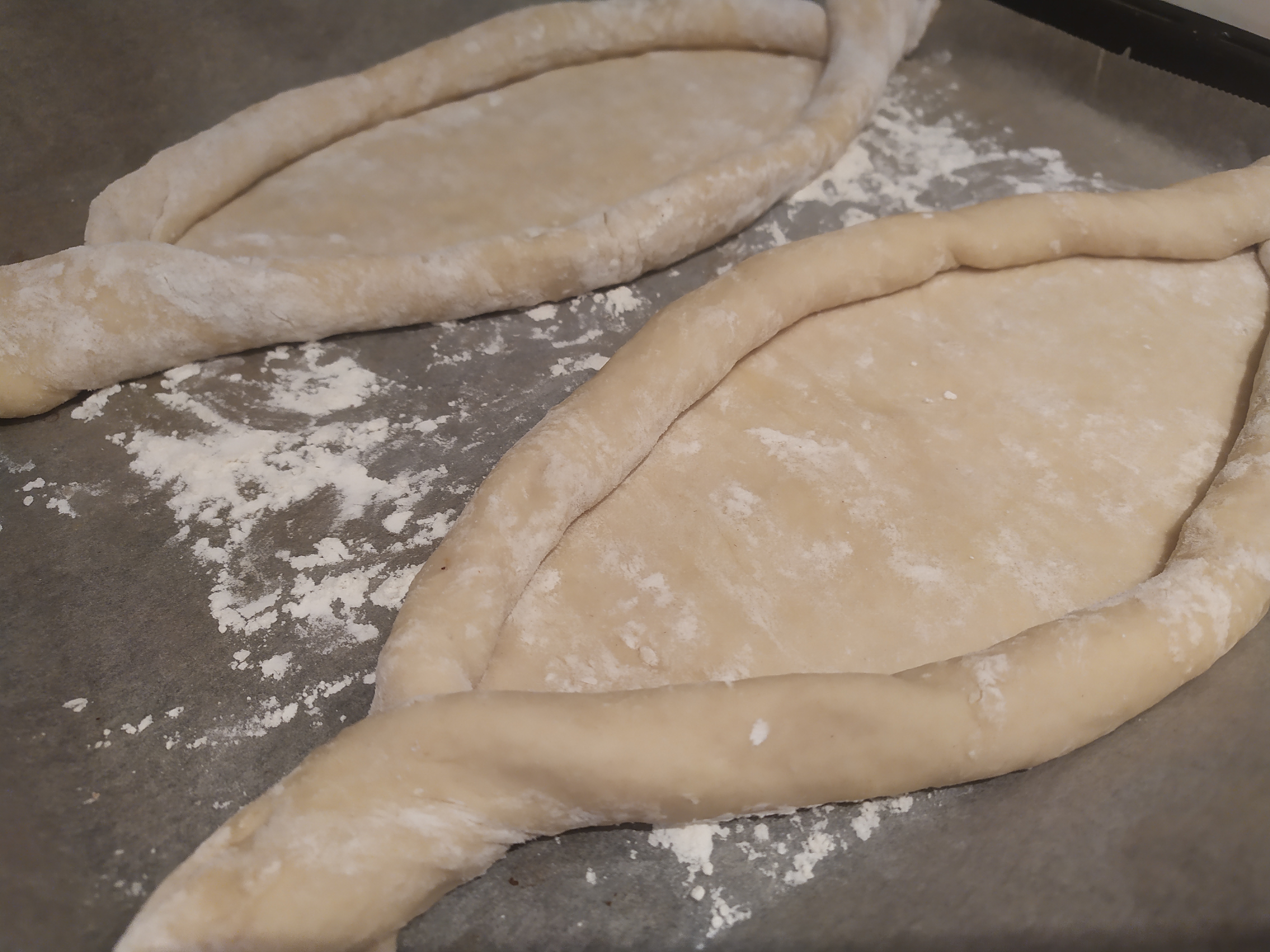 -estiramos cada bola en un papel de horno enharinado y con la ayuda de un rodillo la dejamos finita en forma ovalada. Luego, con las manos enrollamos los bordes y le damos forma de canoa