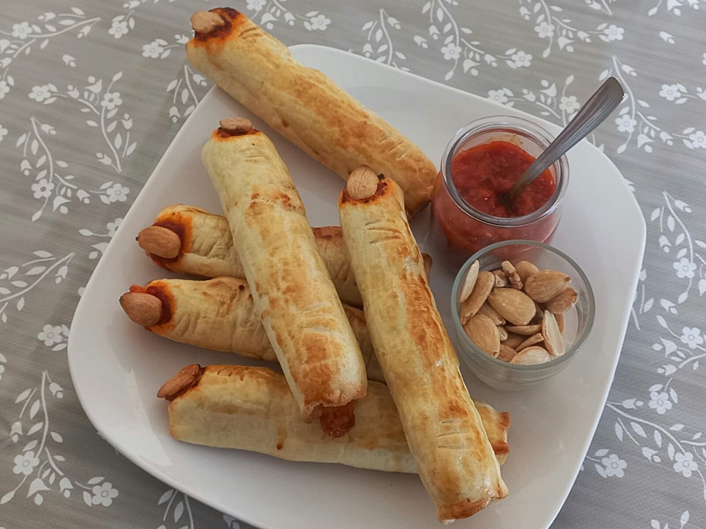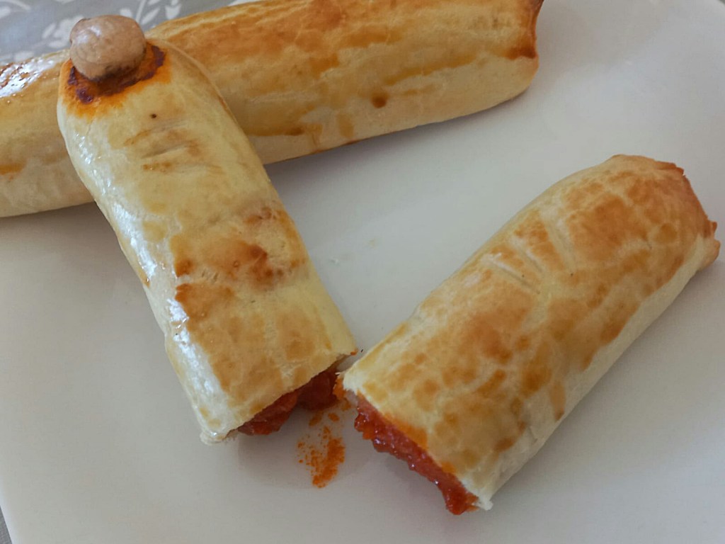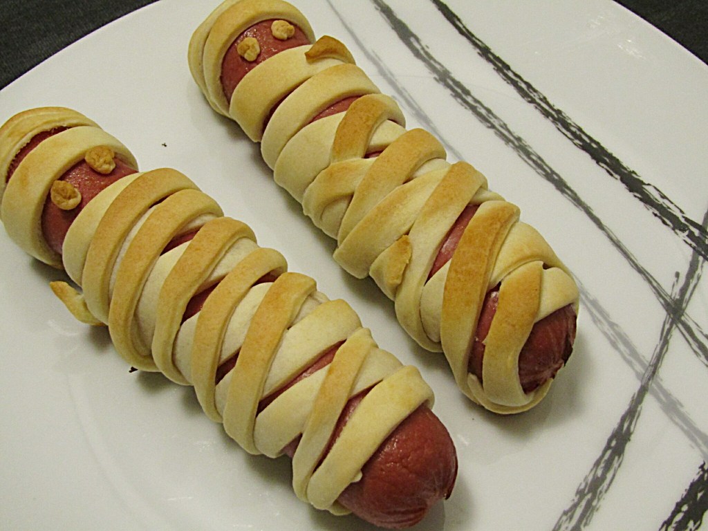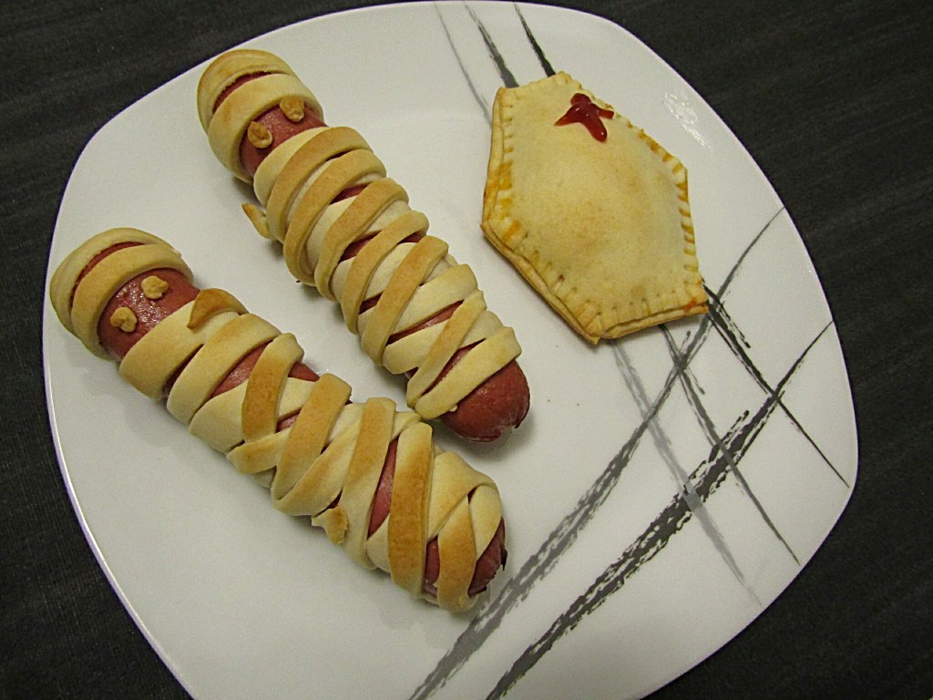 -es tan sencillo como cortar en tiras finitas la masa quebrada y la vamos enrollando alrededor del frankfurt, dejando un espacio para los ojos (también los hacemos con la misma masa)