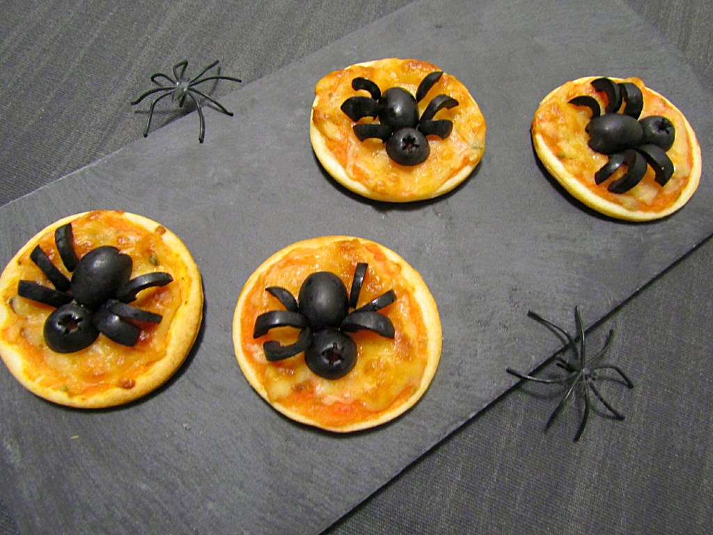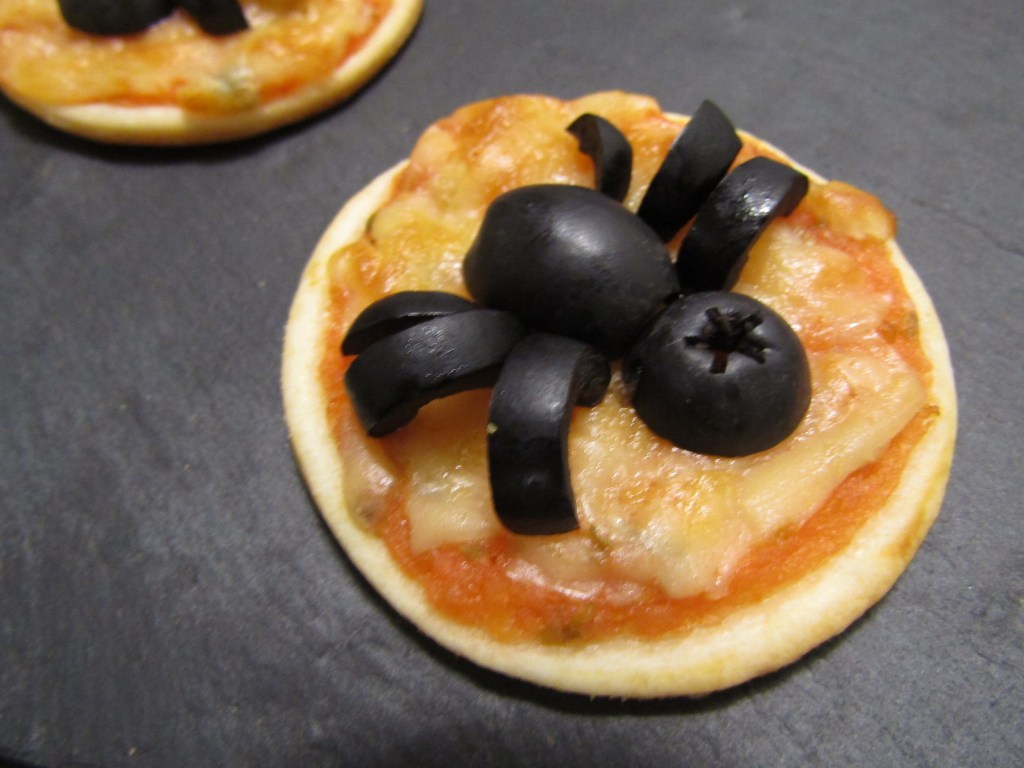 -cuando las retiremos del horno, colocamos las olivas negras troceadas y las colocamos en forma de araña