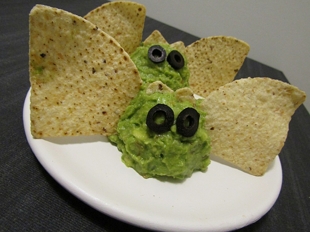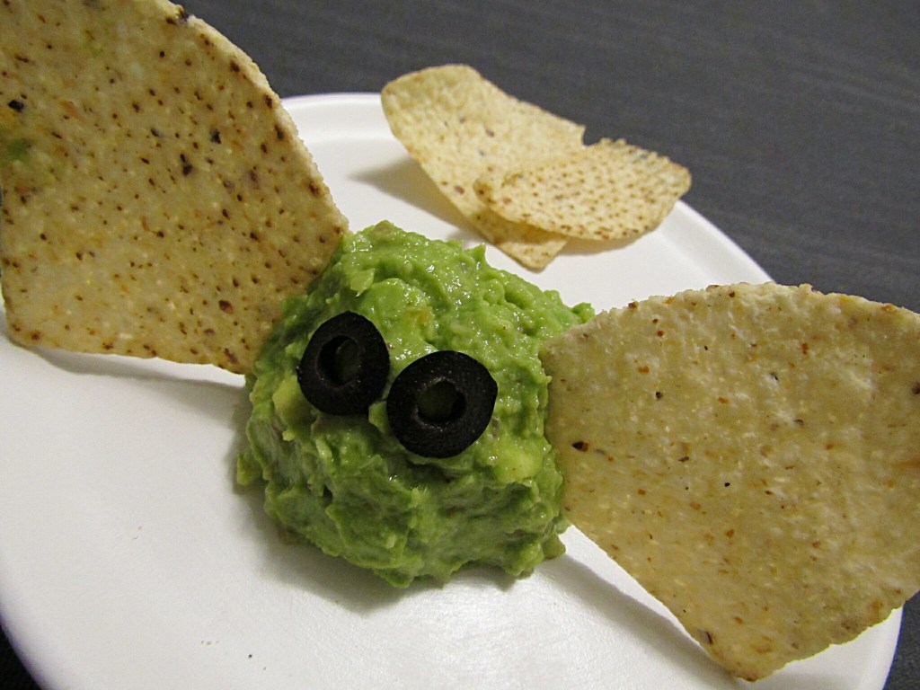 -con la ayuda de una cuchara, colocamos un poco de guacamole encima de un plato en forma de bolita y le colocamos como ojos olivas negras teoceadas y como alas unos nachos
