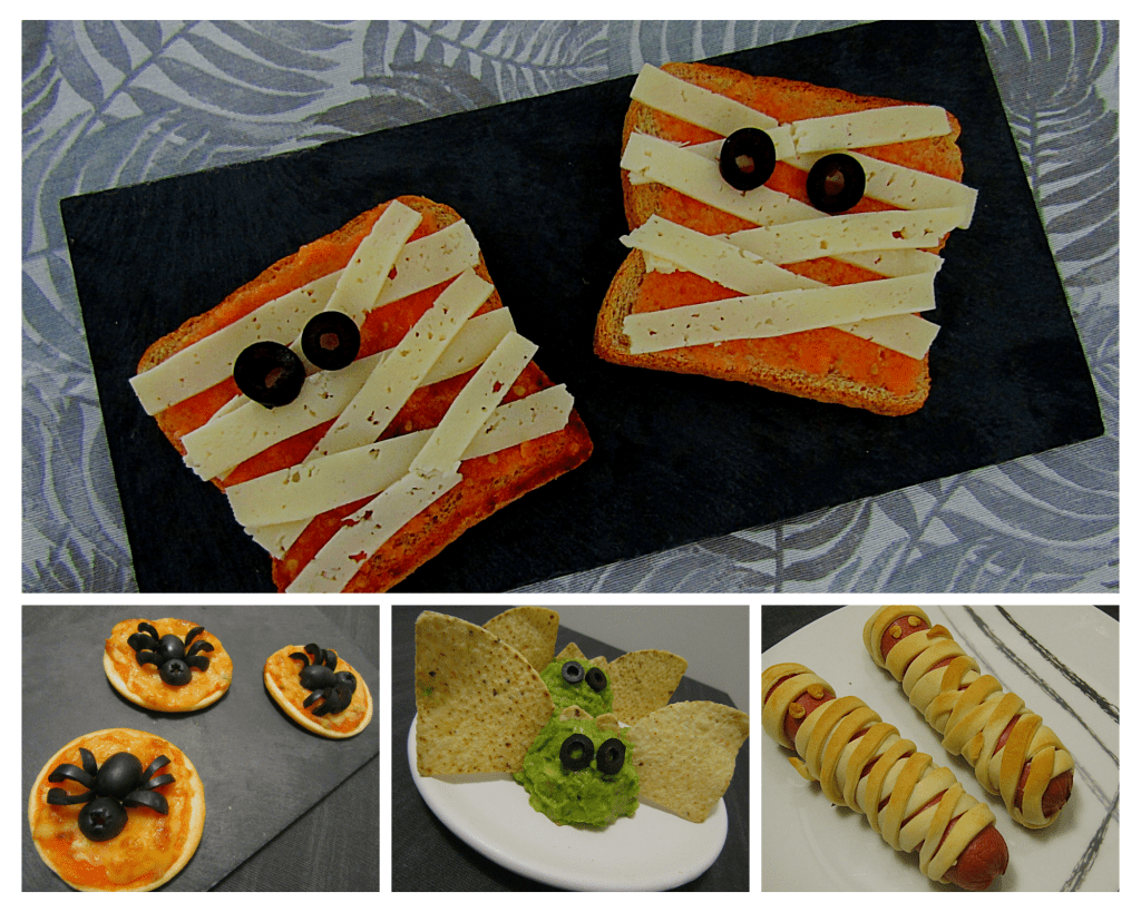 Este año hemos preparado en casa unos aperitivos para Halloween, unas ideas muy sencillas y divertidas. La mayoría de ellos son con masa quebrada, ya que no crece ni se rompe, es muy fácil de trabajarla y da muy buenos resultados. Para estas recetas prefiero esta masa que el hojaldre, pero va a gustos. Además, casi todos los platos llevan los mismos ingredientes (tomate, queso y olivas), así que podéis hacer pocas cantidades de cada y tener variedad de entrantes.
