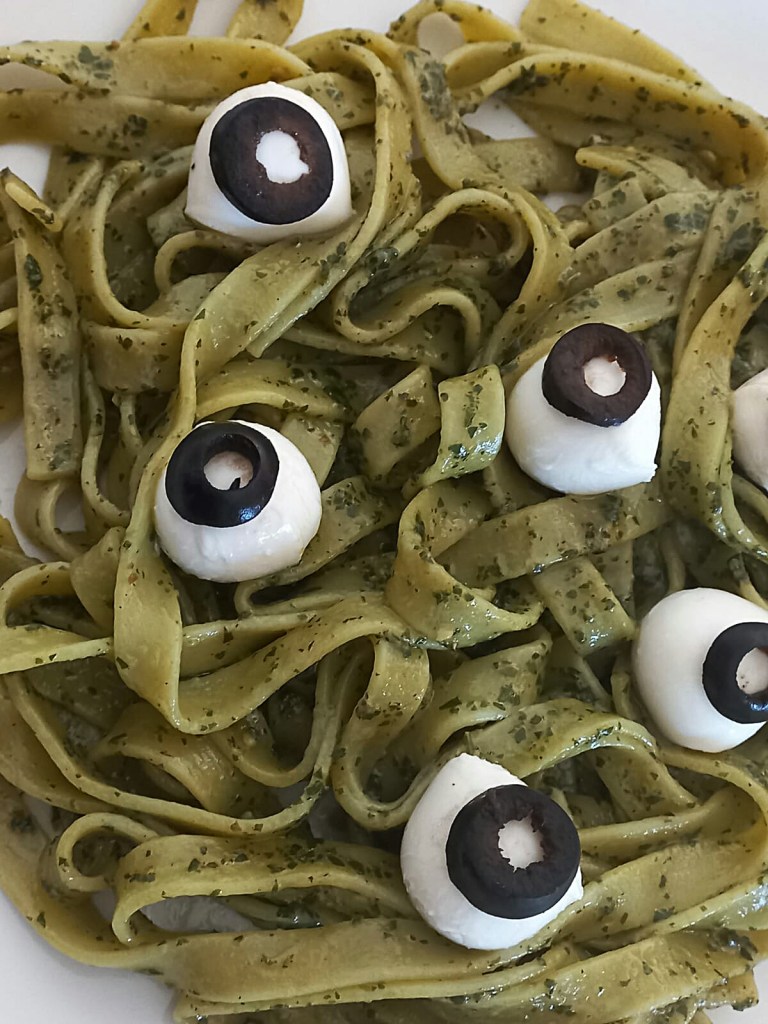 -colocamos también unas tiras de queso cortadas finitas y como ojos olivas negras troceadas