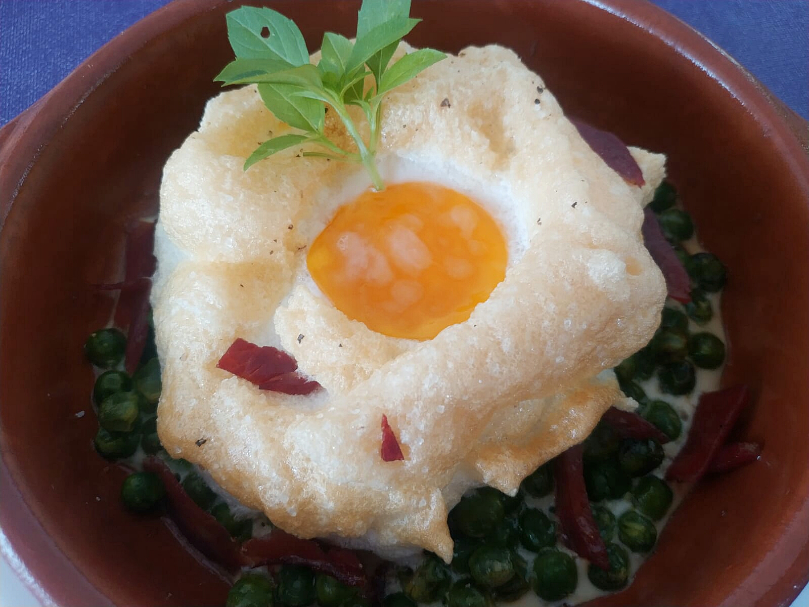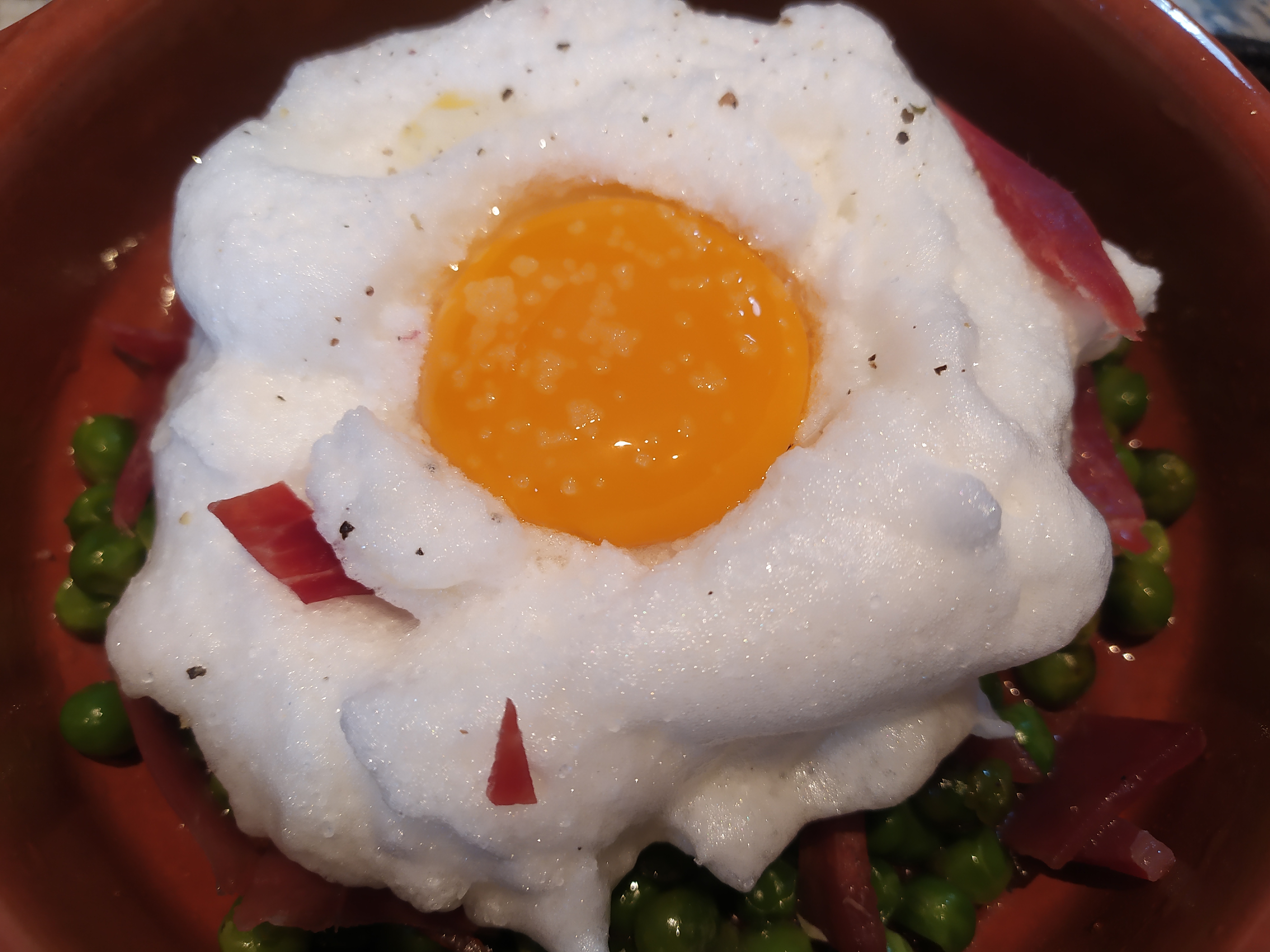 Esta receta que comparto hoy la vi en un programa de cocina de televisión y me llamó la atención. De base lleva guisantes salteados en la sartén con jamón y por encima un huevo nube (la clara a punto de nieve y luego se añade la yema). La combinación nos ha gustado mucho, lo hemos hecho para comer y rinde para cuatro raciones. Si lo hacéis como plato único, podéis añadir más guisantes.