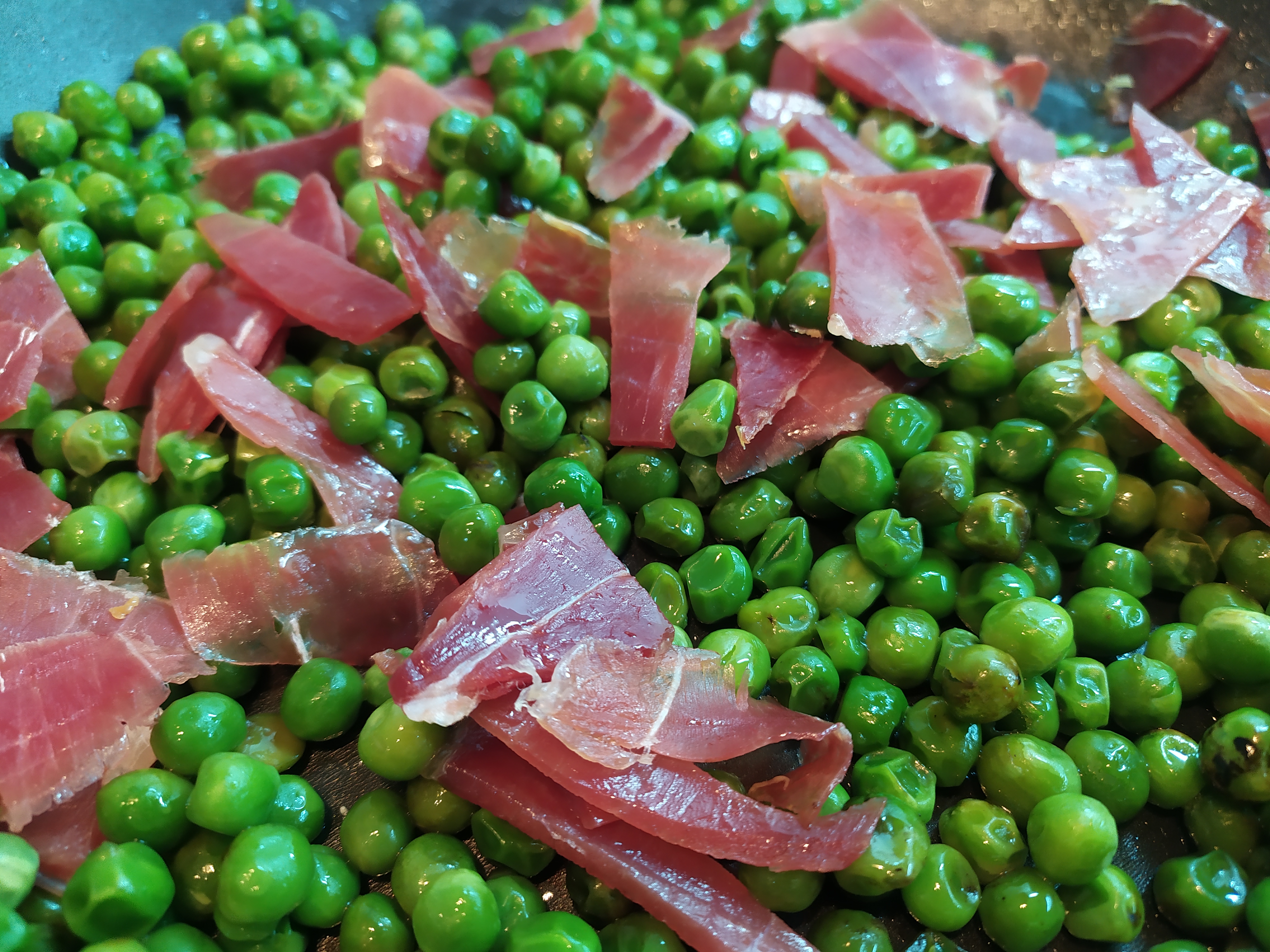 -salteamos los guisantes en la sartén con un poco de aceite y sal