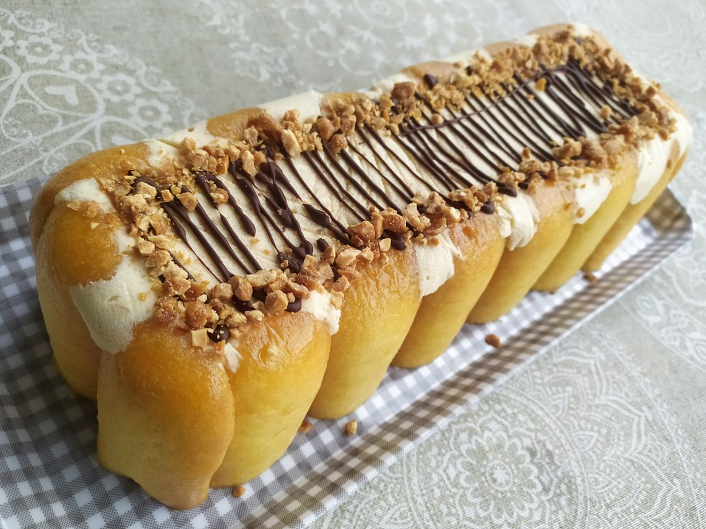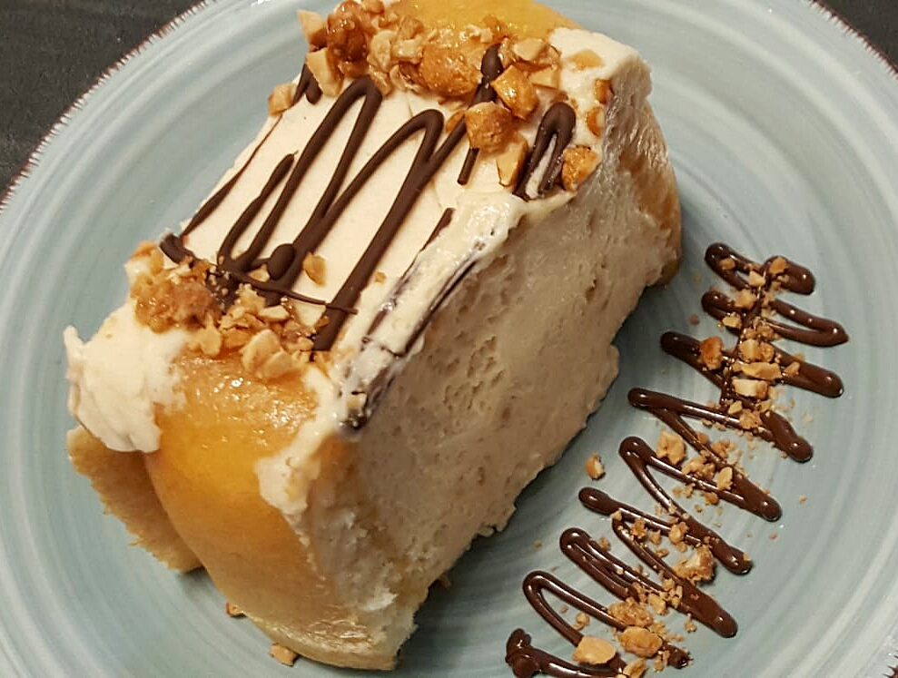 -cuando haya reposado, lo desmoldamos. Lo colocamos boca abajo encima de la bandeja donde lo vamos a servir y sale casi solo. Para decorarlo, le podemos añadir por encima un poquito de chocolate de cobertura fundido y almendras garrapiñadas picadas, que le aporta un toque crujiente