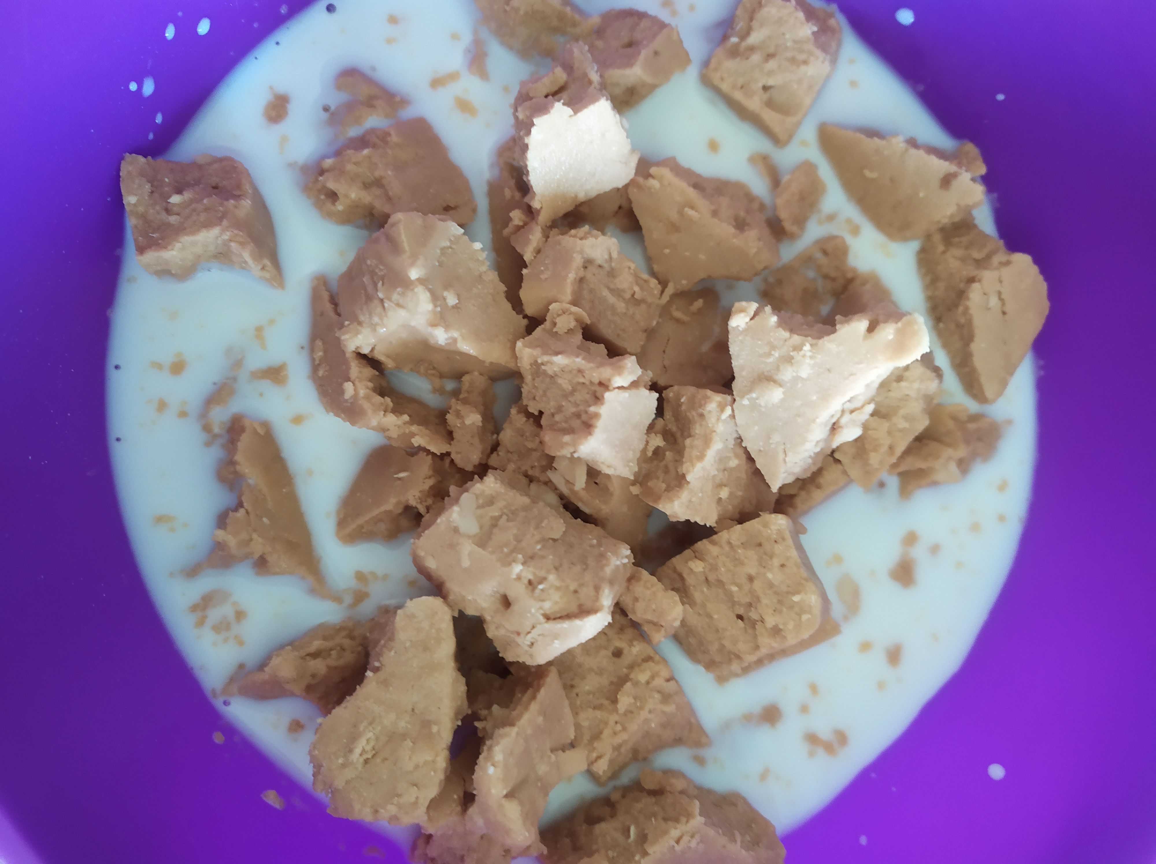 -en un bol, colocamos la leche, el turrón troceado y el azúcar y calentamos en el microondas hasta que el turrón se ablande. Removemos bien hasta que se integren todos los ingredientes