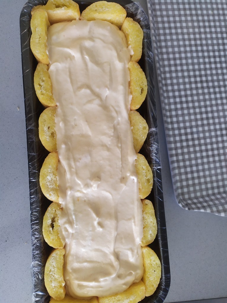 -ahora toca preparar el exterior del postre. Lo primero que hemos hecho ha sido forrar el molde con film transparente. Luego, recortamos los bizcochos a la altura de nuestro molde para que no sobresalgan y los vamos mojando en el sirope de naranja que hemos preparado (tiene que estar templado para que empape bien). Cuando los tengamos mojados, los vamos colocando en las paredes del molde uno al lado del otro