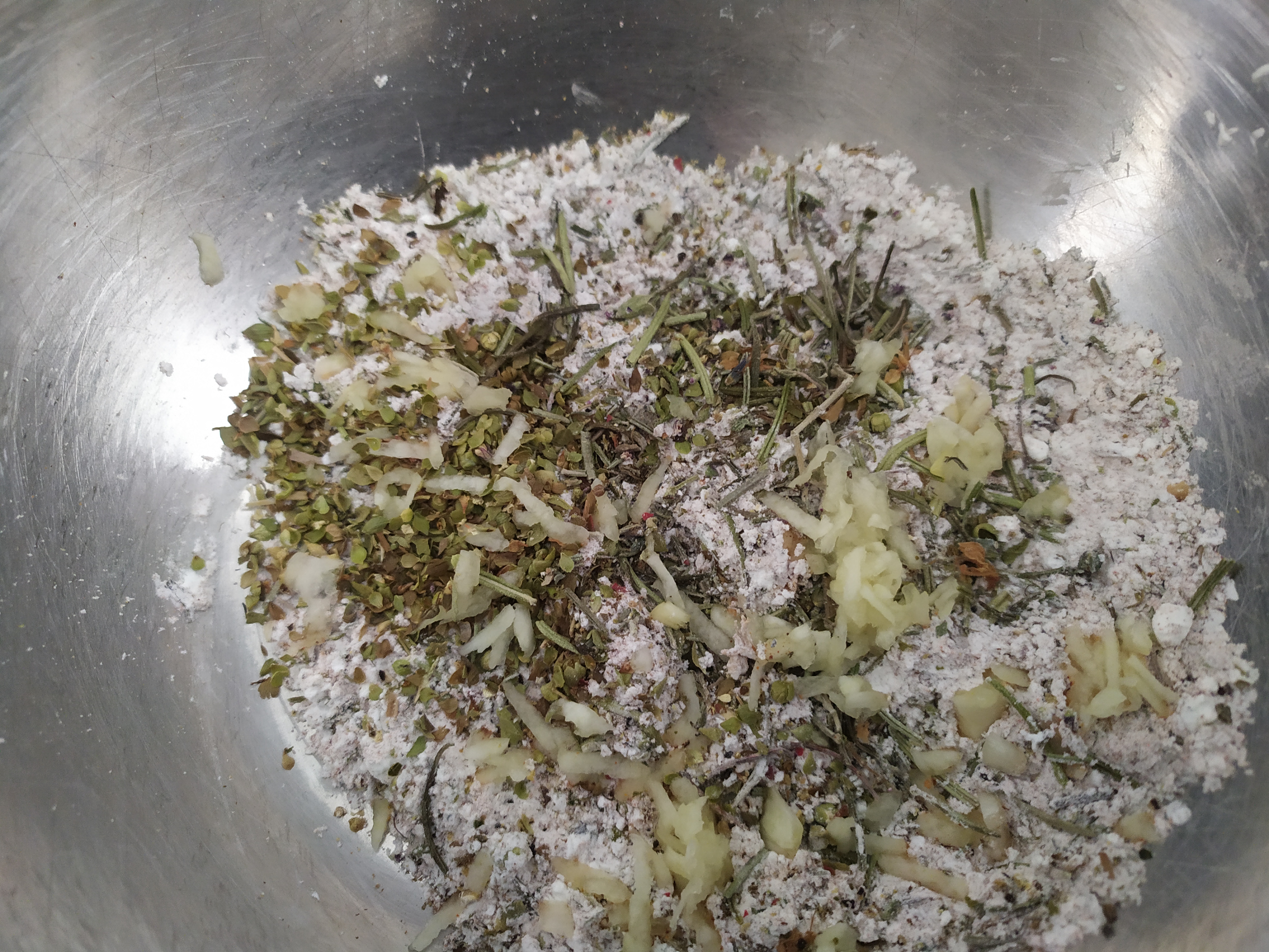 -por otro lado, en un bol mezclamos el orégano, las hierbas aromáticas, la sal, la pimienta, el pimentón, el ajo rallado y la harina de maíz