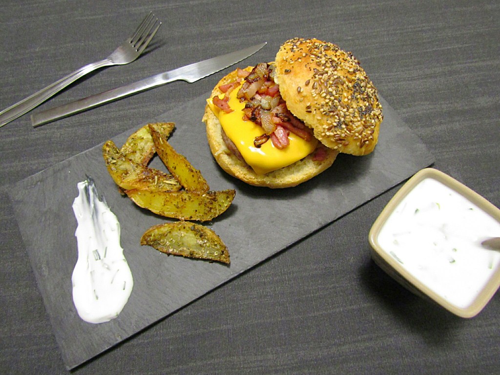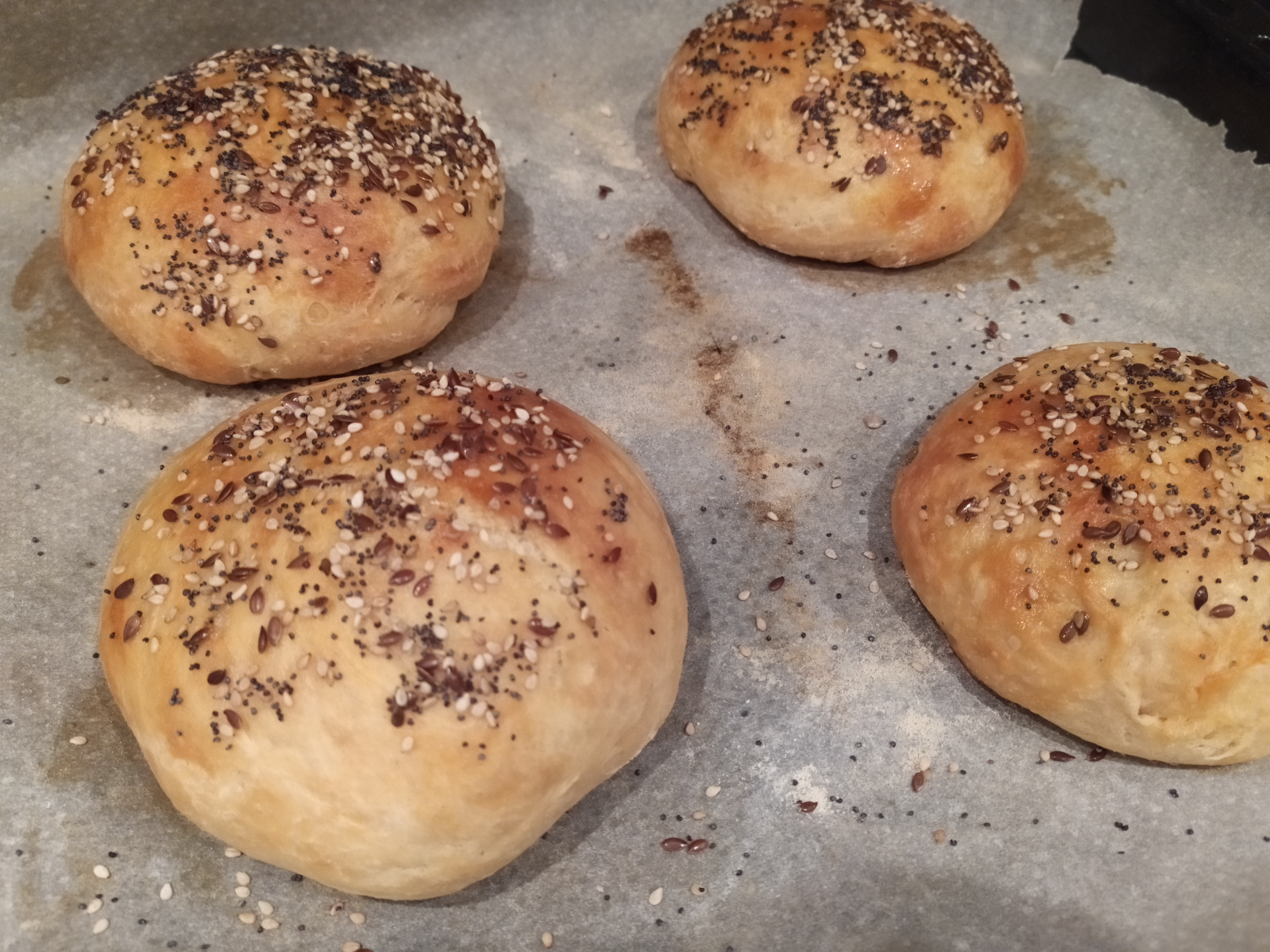 La otra noche, para cenar preparamos pan de hamburguesas, que acompañamos con unas patatas gajo hechas al horno con una salsa parecida a la deluxe. Es una receta muy sencilla y fácil de preparar, pero que necesita tiempo para que el pan fermente y repose. Por encima le hemos añadido mezcla de semillas que teníamos en casa y para que se peguen, hemos pintado el pan con un poco de mantequilla derretida cuando las hemos retirado del horno. Ha sido una de esas recetas que nos ha sorprendido para bien.