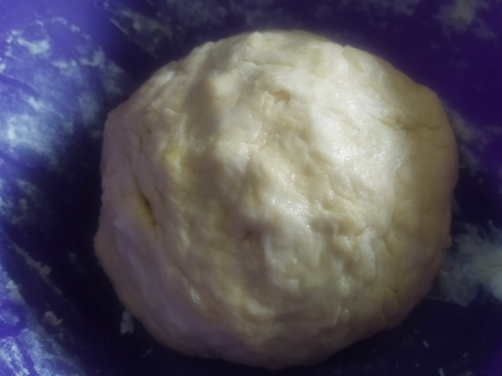 -en un bol, colocamos la harina y la sal y hacemos un hueco en el medio para añadir el agua y la levadura. Incorporamos también el huevo, el azúcar, la mantequilla a temperatura ambiente y la leche. Mezclamos bien y amasamos con las manos hasta obtener una bola que no se nos pegue en las manos (nosotros lo hemos hecho con las manos impregnadas de aceite de oliva)