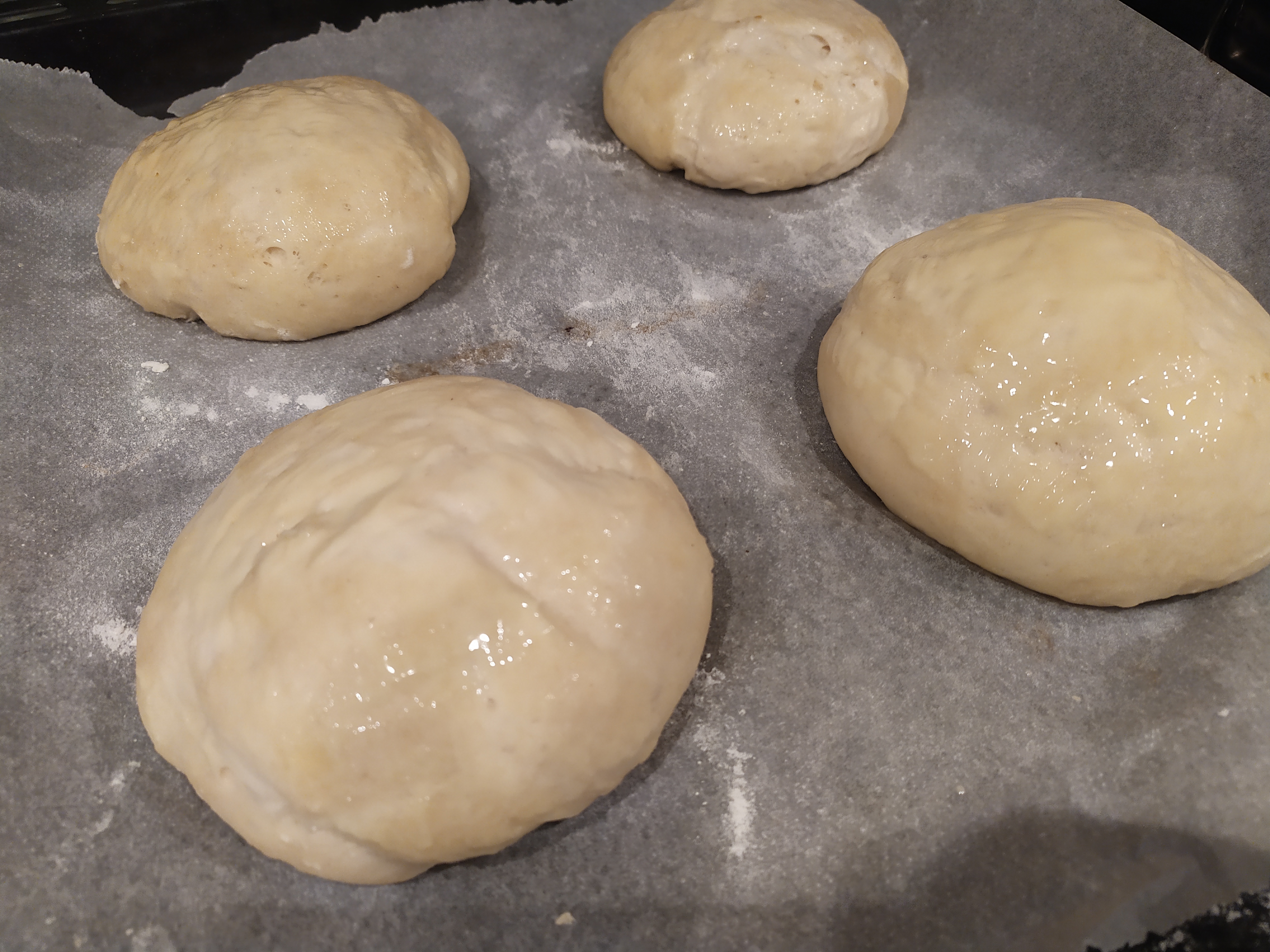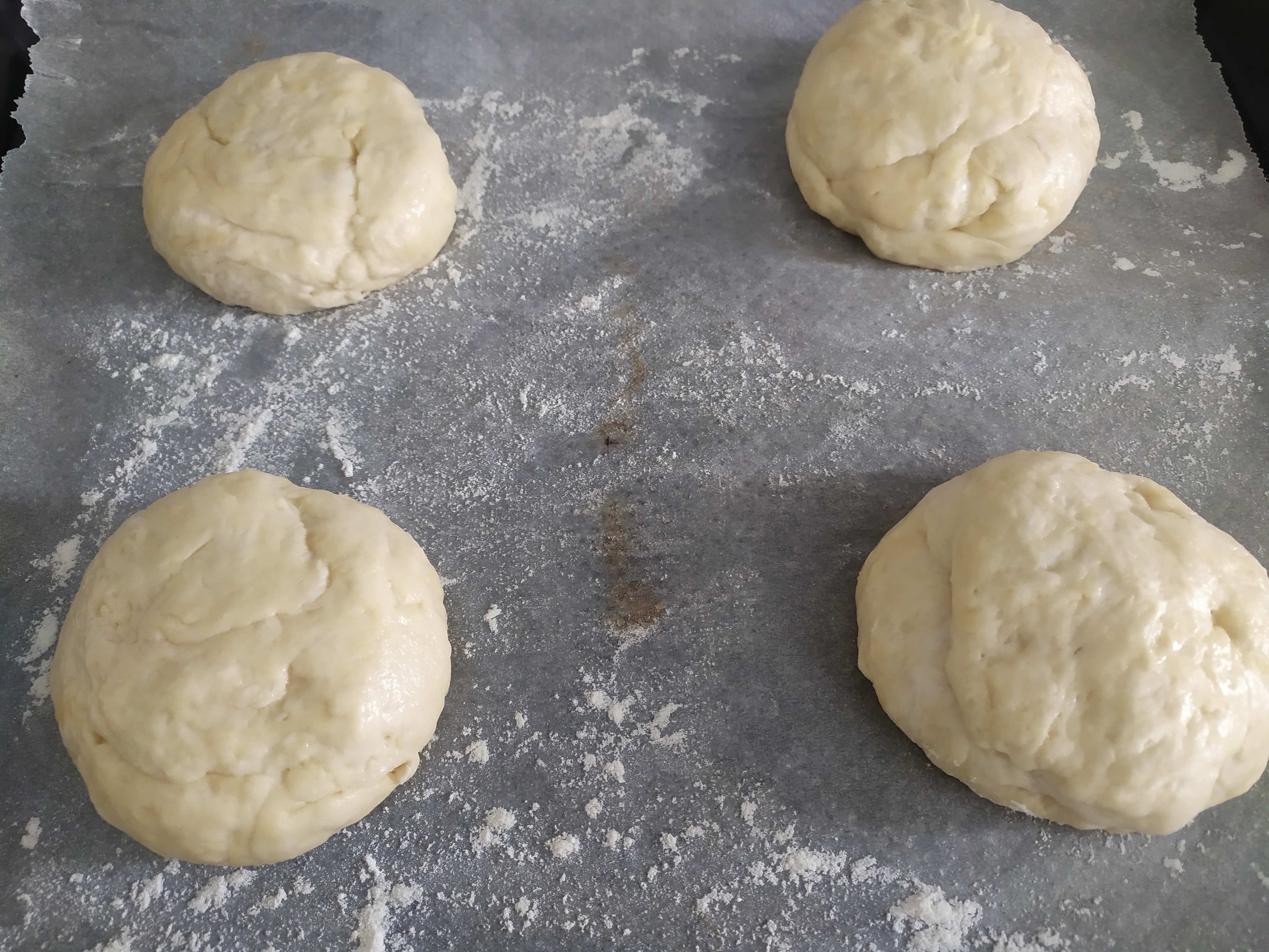 -cuando la masa haya fermentado, la dividimos en 4 y hacemos bollitos, que colocamos encima del papel de horno separados, ya que vuelven a crecer. Los chafamos con la mano un poco (pero muy poquito). Los dejamos reposar 3 horas