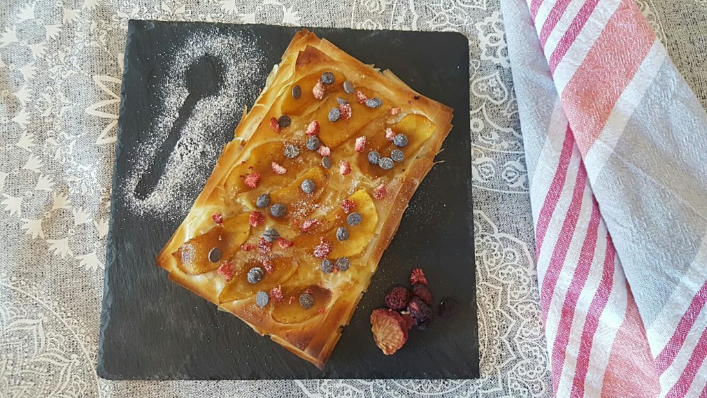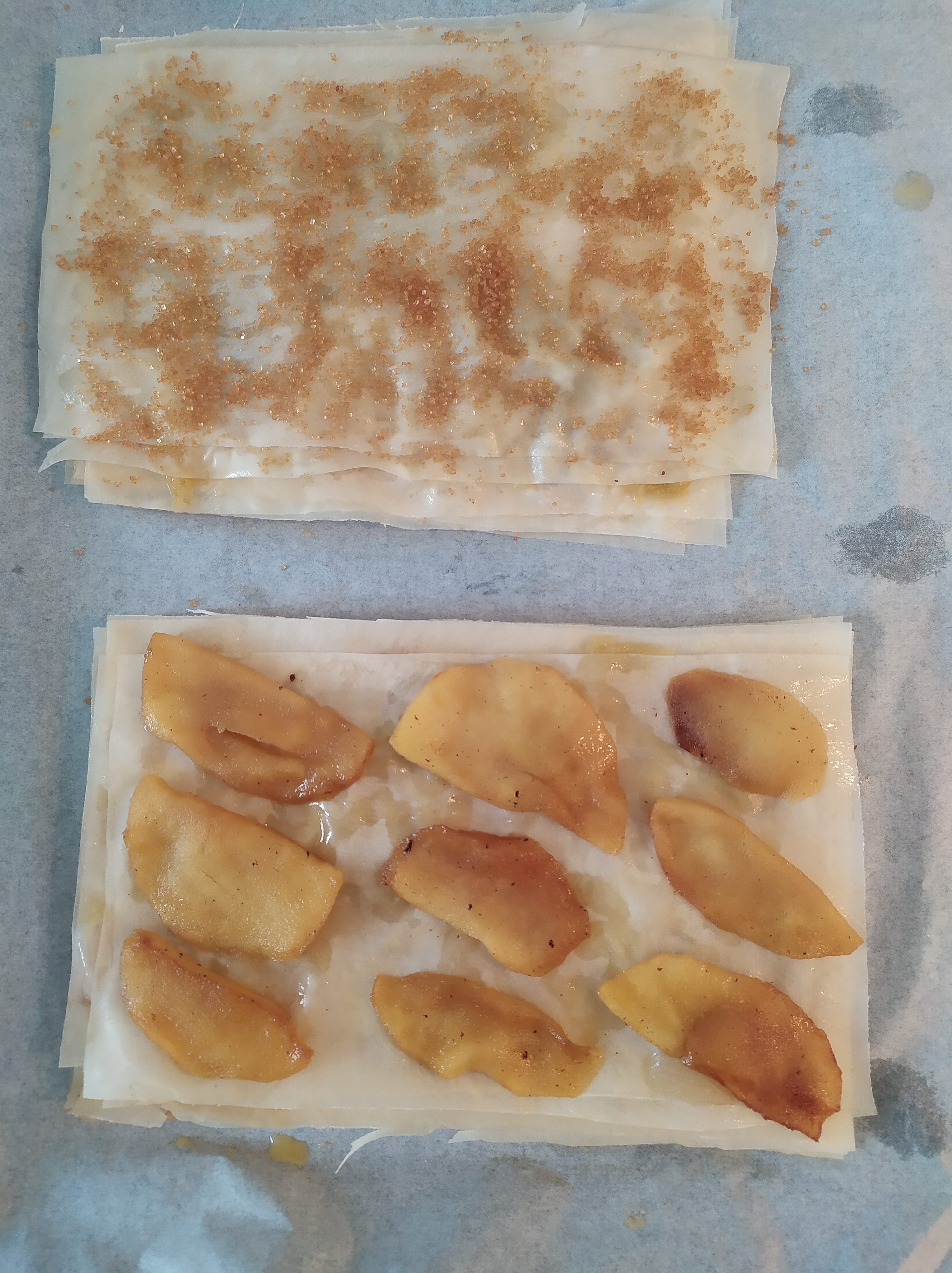 -a la hora de montar nuestro postre, vamos alternando capas de masa pintadas con mantequilla derretida y capa de manzana (mejor colocar dos o tres láminas juntas para que aguante bien el relleno)