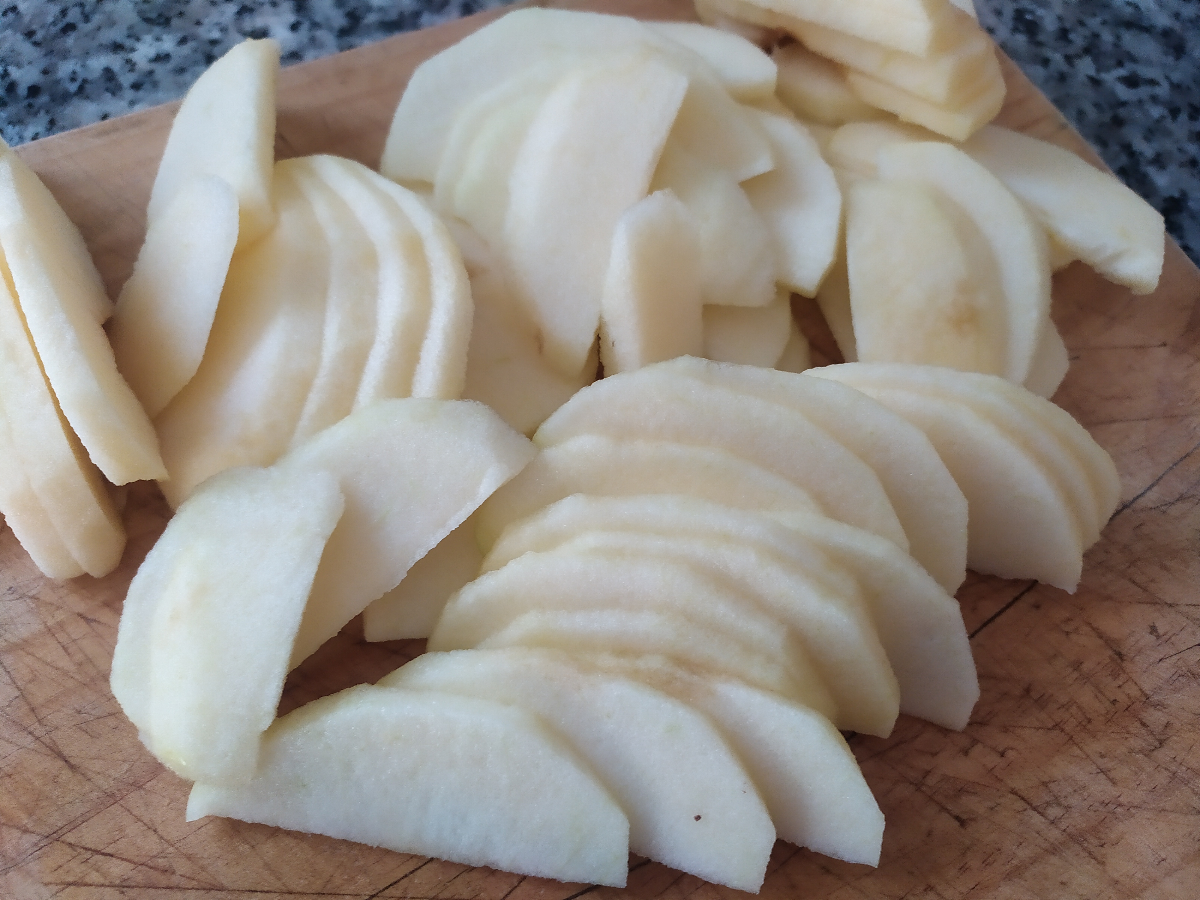 -podemos rellenar alguna capa también con mermelada. Podemos acabar el montaje con unos trocitos de manzana y espolvoreado con azúcar moreno