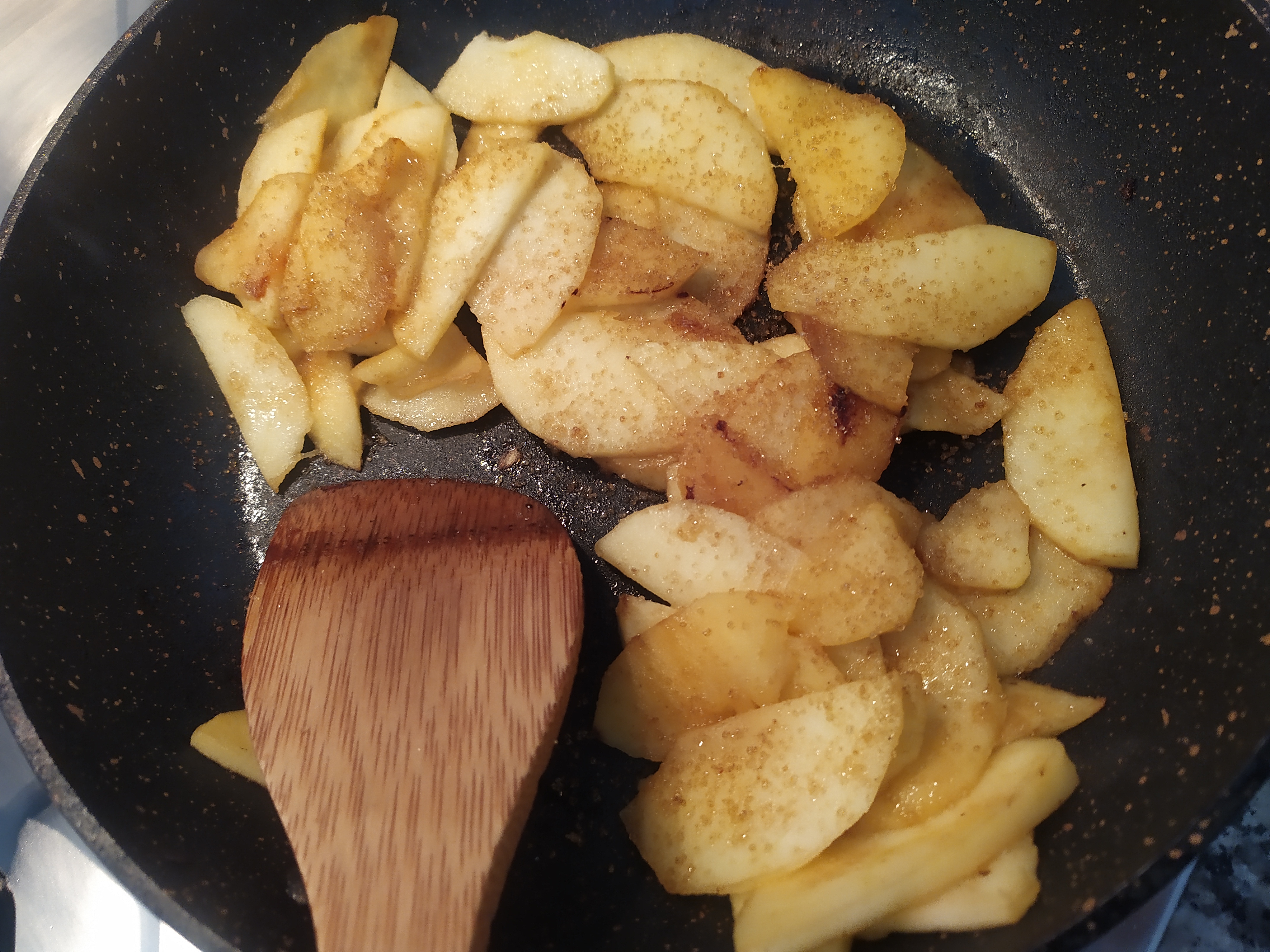 -pelamos y cortamos la manzanas finitas, que cocinamos un poco en la sartén a fuego flojo con un poco de mantequilla. Cuando estén doraditas, les añadimos un poco de azúcar moreno y dejamos que caramelice