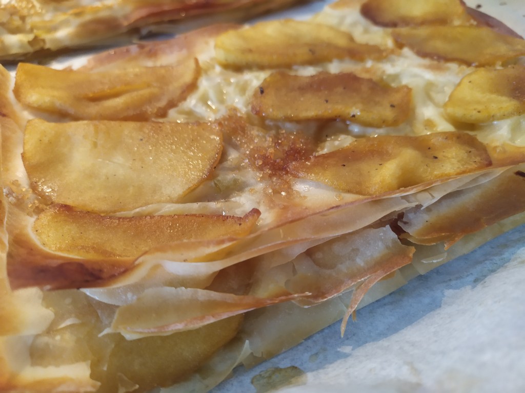 Este fue otro de los postres improvisados que preparado mi madre y yo antes del nuevo confinamiento para redondear la comida del domingo. Teníamos un paquete de masa filo y manzanas, así que preparamos una lasaña de manzanas. Es una fruta que nos encanta y da mucho juego en la cocina para hacer infinidad de recetas. En esta ocasión, las hemos cocinado primero un poco en la sartén para que pierdan agua, se doren un poquito y cojan sabor, ya que las mezclamos con mantequilla y azúcar moreno. Luego es tan sencillo como pintar las láminas con mantequilla derretida e ir haciendo capas. Algunas de ellas llevan relleno de mermelada. Nosotras hicimos cuatro porciones, cortando las láminas antes de hacer el montaje.