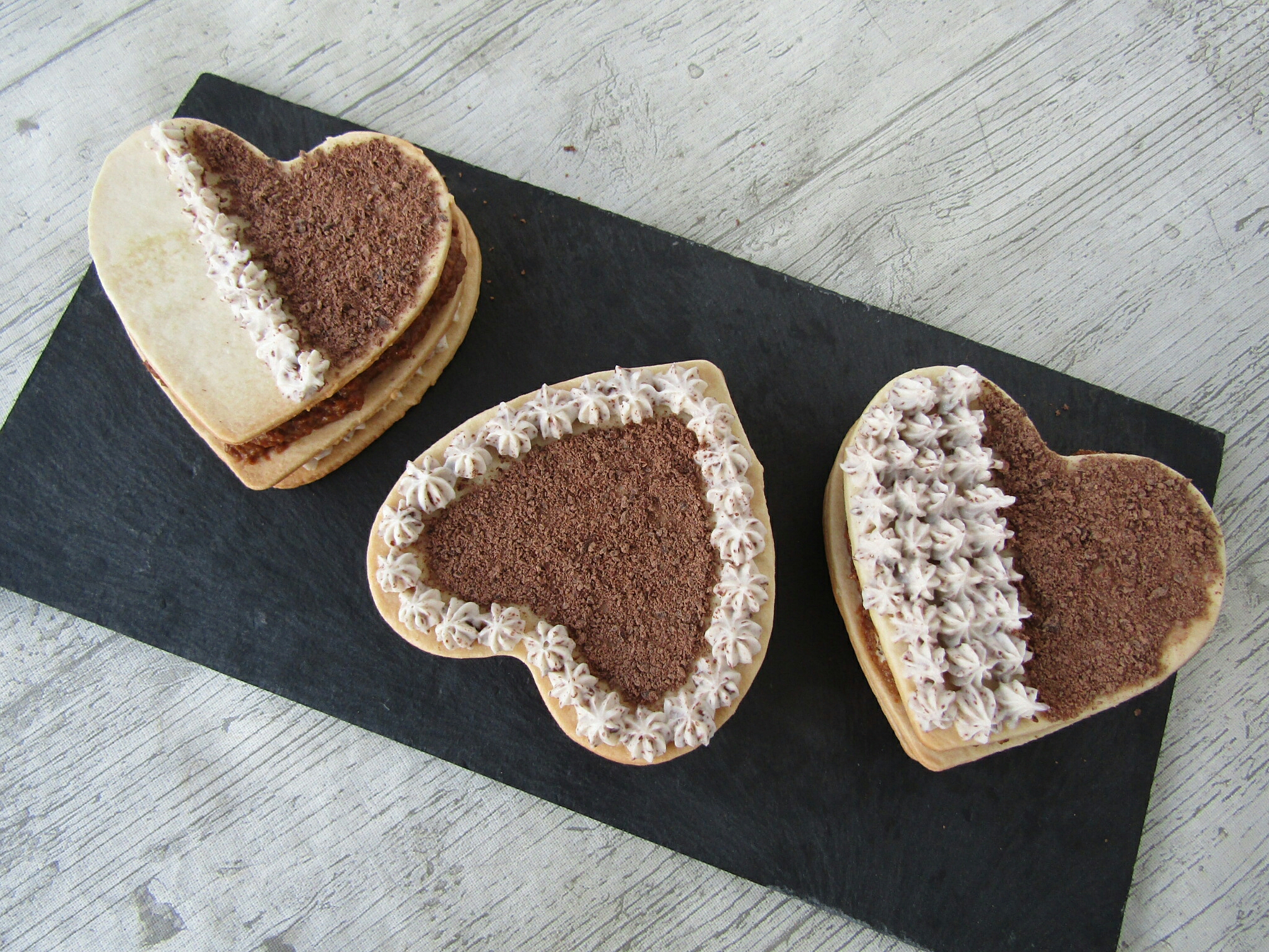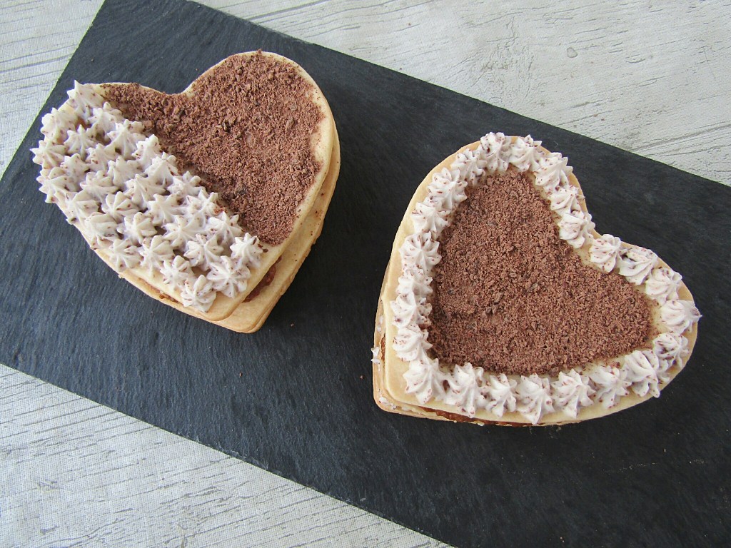 -a la hora de montar el postre: colocamos una base de masa quebrada y encima añadimos la preparación de café y galletas. Colocamos encima otro corazón y añadimos la otra mezcla de queso crema y chocolate. Ponemos otra capa de masa quebrada y por encima la decoramos (yo he utilizado el relleno del queso crema y un poco del chocolate rallado, pero también podéis espolvorear cacao)