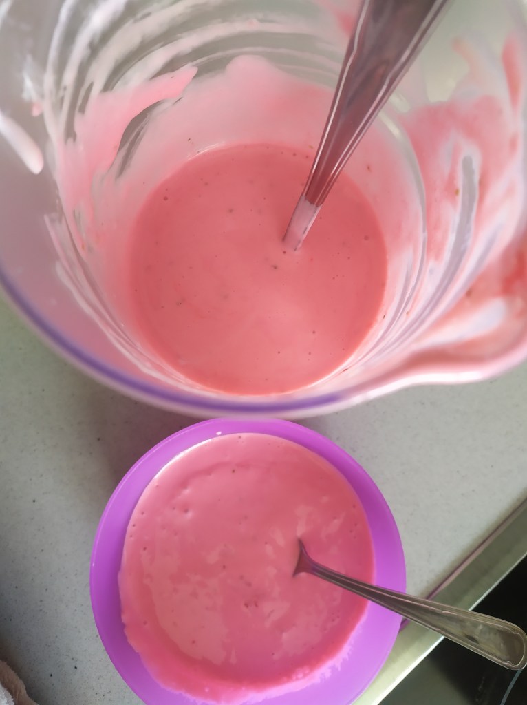 -mezclamos las fresas trituradas con el queso crema y el azúcar hasta que esté todo bien integrado