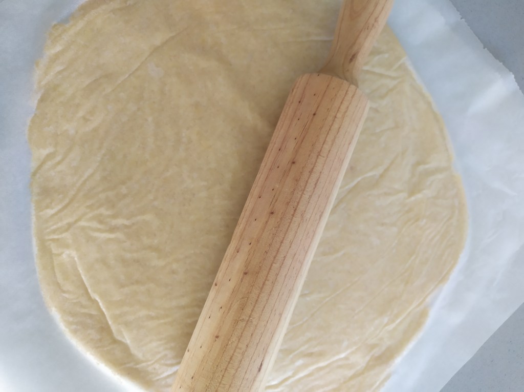 -ahora, estiramos la masa entre dos papeles de horno con la ayuda de un rodillo y la dejamos del grosor deseado