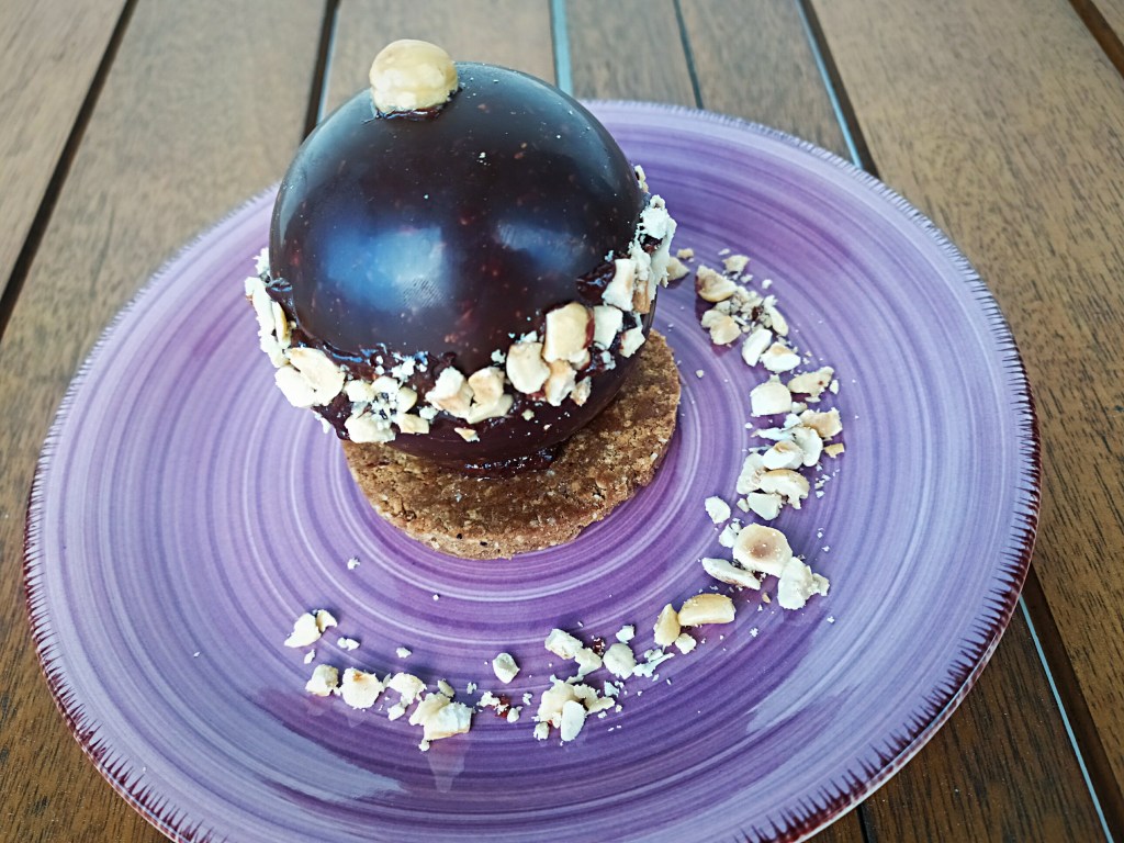 -a la hora de servir, podemos juntar dos semiesferas y pegarlas con un poco de chocolate fundido en los extremos, con avellanas picadas por encima. Nosotros hemos colocado la esfera encima de una base de galleta y mantequilla
