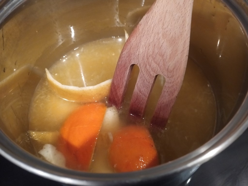 -empezamos preparando el sirope de limón y naranja donde bañaremos los bizcochos par hacer las paredes de la tarta. Para ello, ponemos en una olla el agua, el azúcar, el zumo de limón y de naranja y las cáscaras de limón y naranja, que dejamos a fuego flojo hasta que hierva (vamos removiendo) y espese un poco. Reservamos