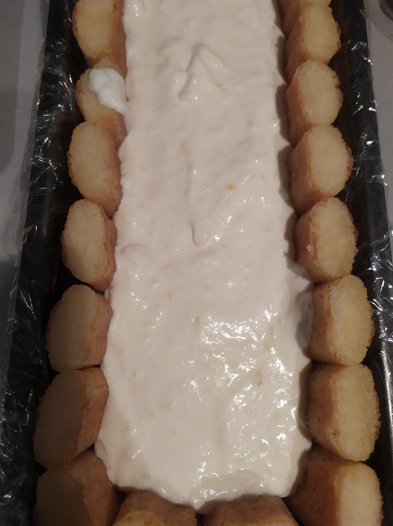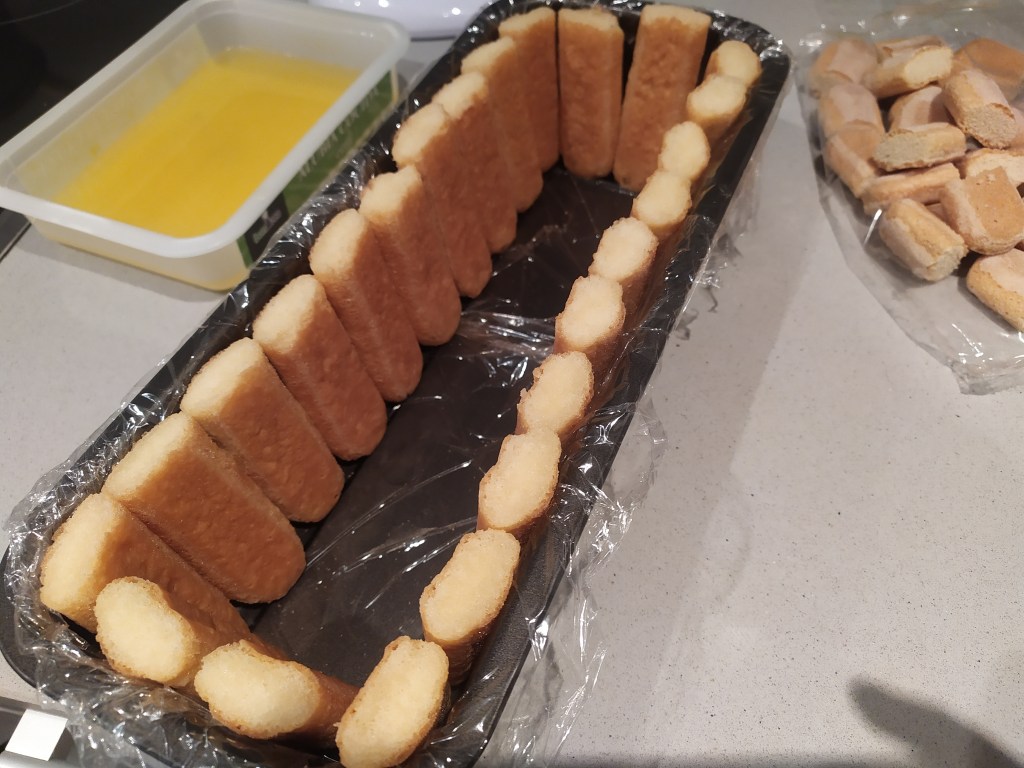 -cuando el sirope esté casi frío (si está caliente los bizcochos se ablandarán demasiado), mojamos los bizcochos un poco y los vamos colocando en el molde