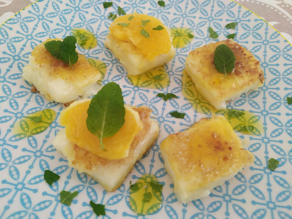 Esta es una adaptación de la tradicional leche frita, que vi en Cocina al Punto y me gustó. El fin de semana la he preparado con mis abuelos, ya que desde que vi la receta pensé en hacerla con mi abuela, que es muy golosa y le encantan los postres tradicionales. Por la mañana preparé la base, que dejé reoosar en la nevera y por la tarde la llevé a su casa y acabamos la receta, que nos quedó genial. Este dulce está preparado a la plancha con poco aceite, no es frito, y queda igual de bueno. Además, para darle un toque diferente, va acompañada de un coulis de naranja y unos trocitos de naranja. También lleva un toque de menta, tanto al infusionar la leche como para el coulis y la decoración. Inspirda en el programa que vi, el azúcar lo hemos caramelizado con un soplete. Una receta muy recomendable para hacer en familia.