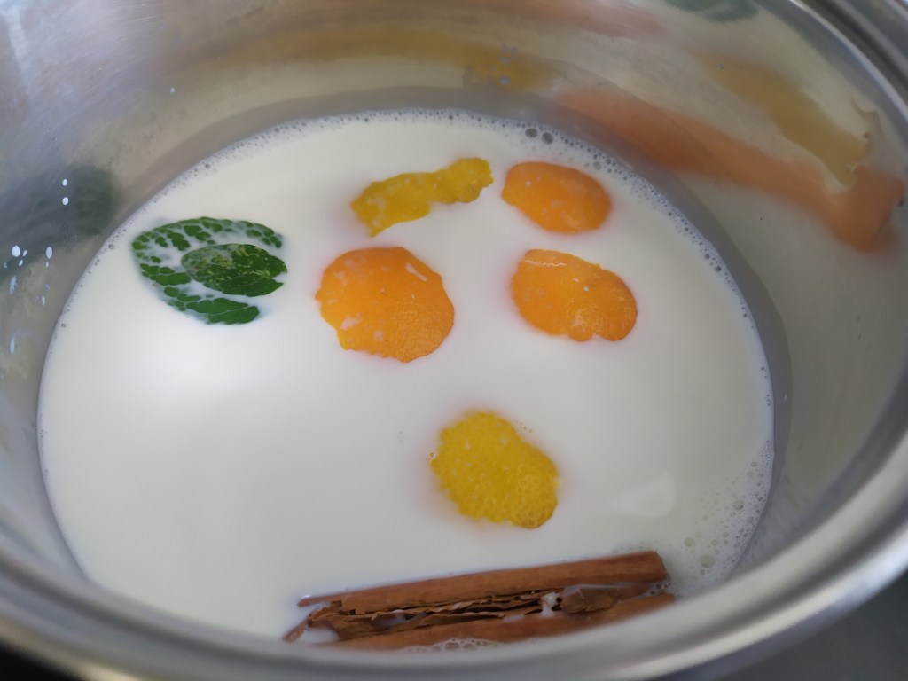 -vertemos la leche y la nata en una olla junto con una rama de canela, unas hojas de menta y cáscara de limón y naranja