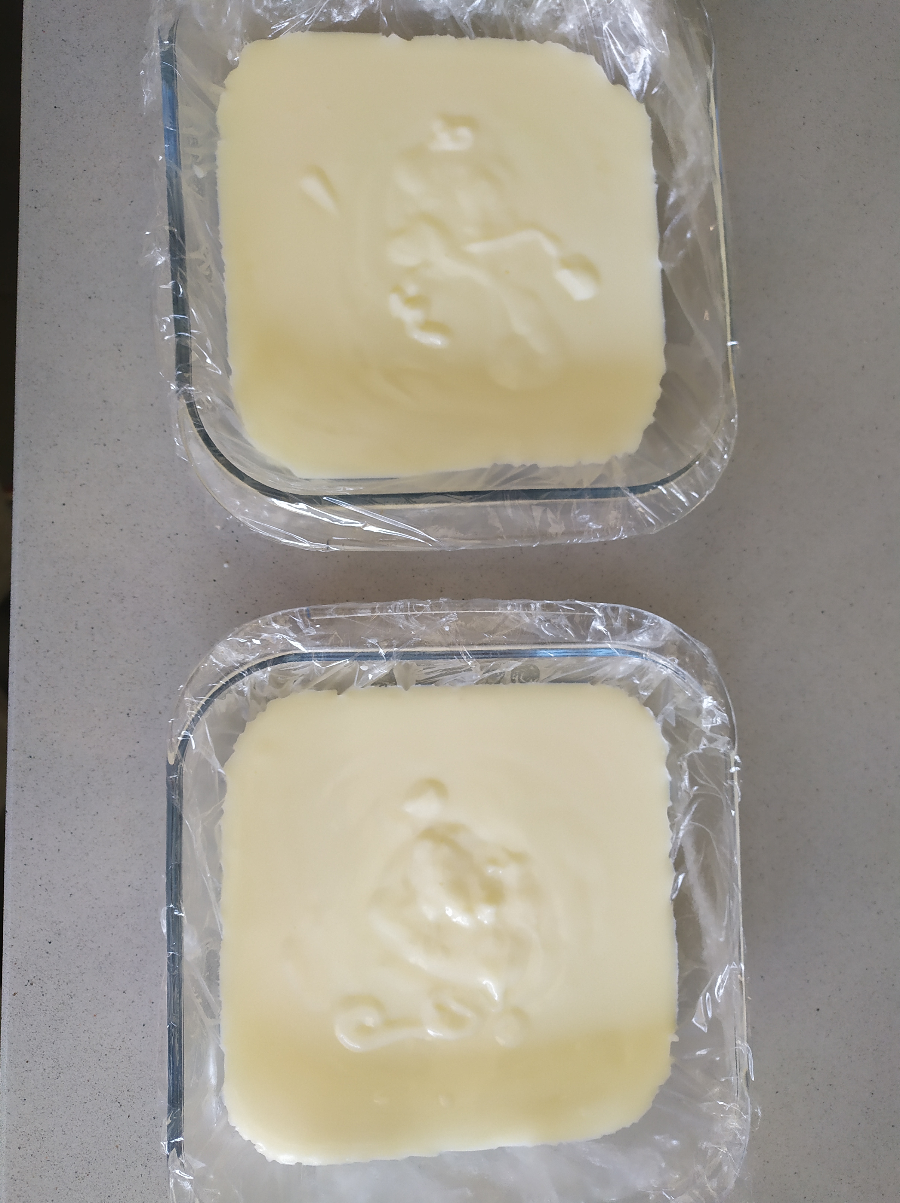 -vertemos la prearación en el molde y dejamos enfriar en la nevera (mínimo 3 horas, pero de un día para otro está más consistente). Tapamos la mezcla con film transparente por encima para que no se seque