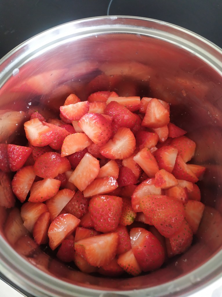 -empezamos preparando el relleno de la tarta. Para ello, lavamos bien las fresas y las troceamos. Las colocamos en una olla con unas gotas de limón y dos cucharadas de azúcar. Las dejamos media hora a fuego medio (vamos removiendo)