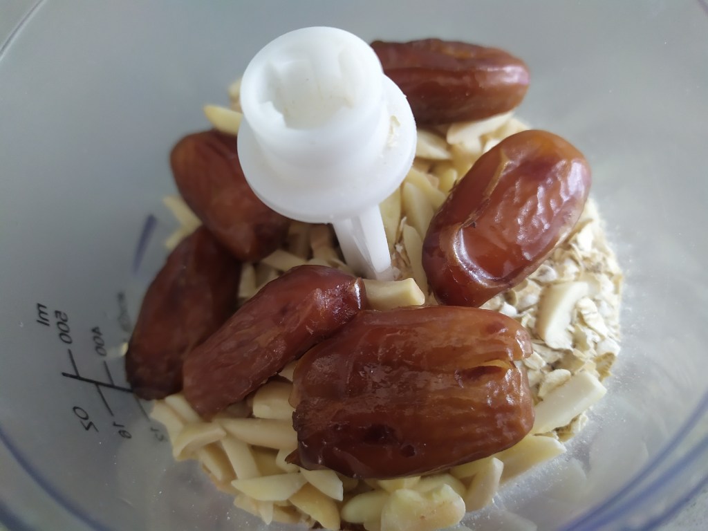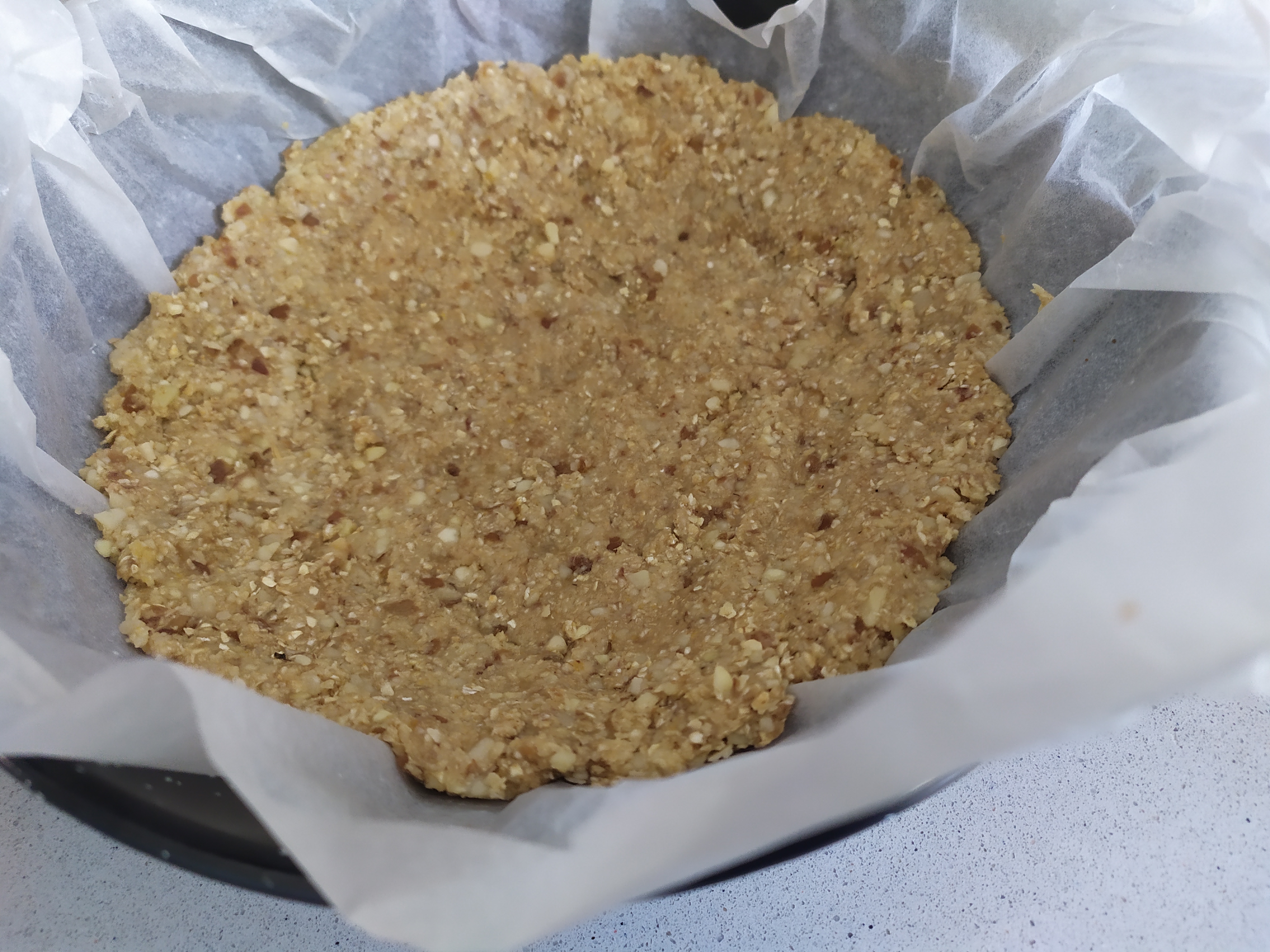 -mientras se cocinan las fresas, preparamos la base de la tarta. Ponemos en una picadora los copos de avena, las almendras, los dátiles y la miel y picamos bien. Chafamos la mezcla con las manos y añadimos un poquito de agua (muy poca) para que la masa no esté tan compacta