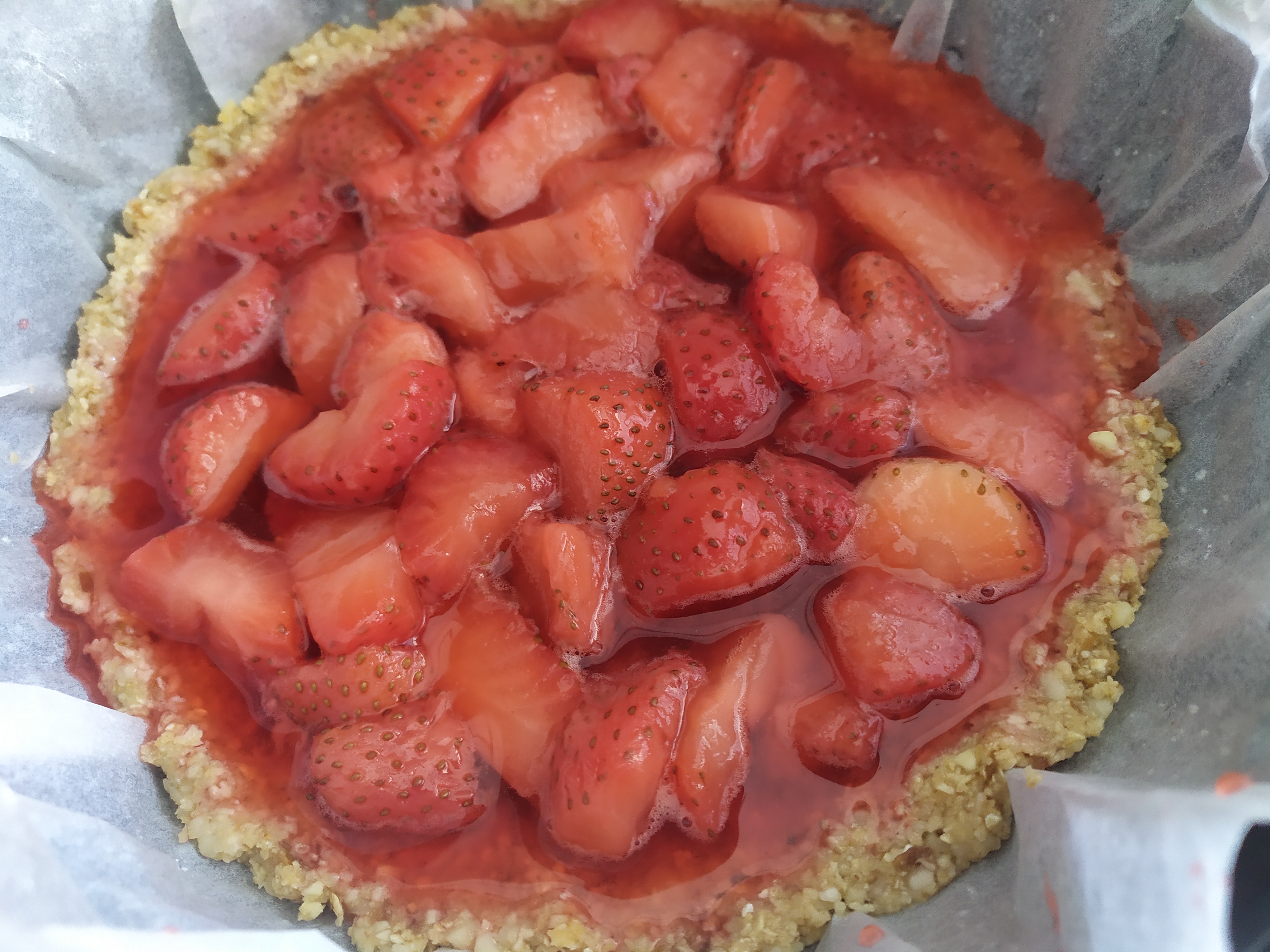 -colocamos la base en un molde cubierto con papel de horno y levantamos un poco los bordes. Vertemos el relleno de fresas en el interior y dejamos reposar en la nevera