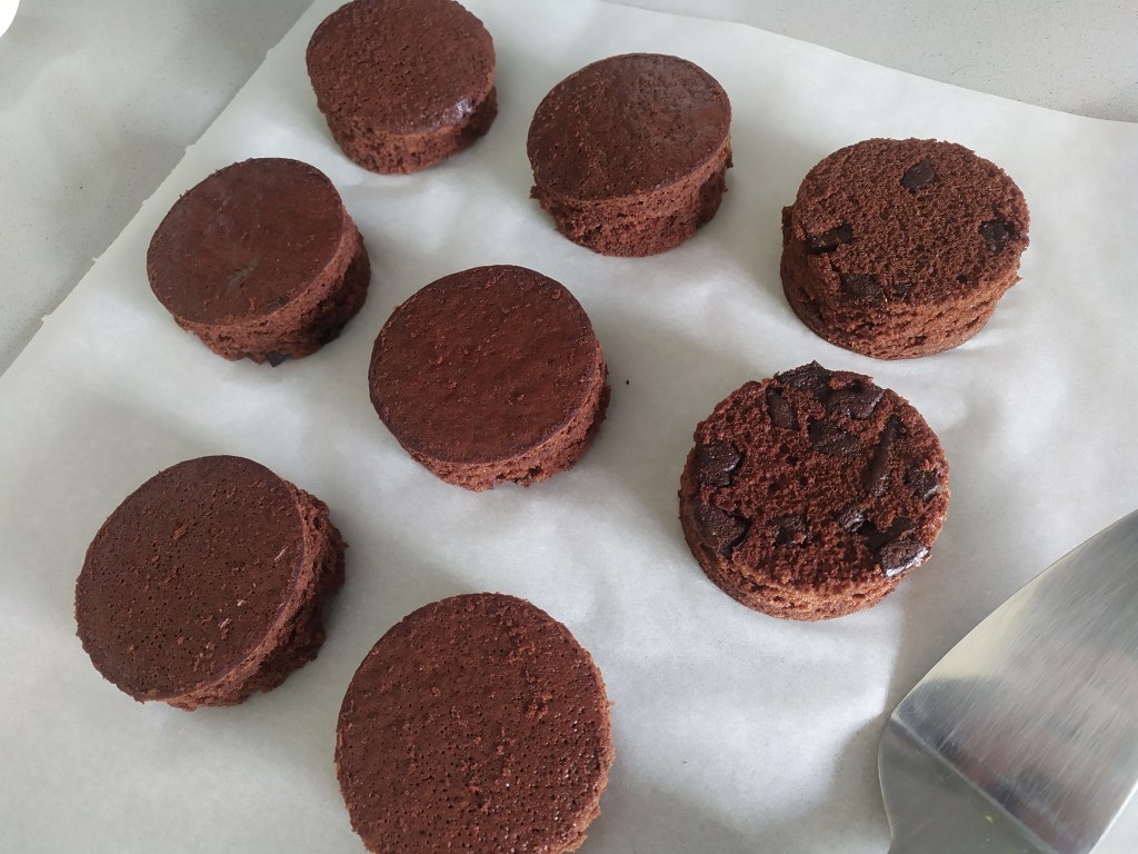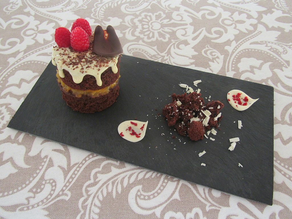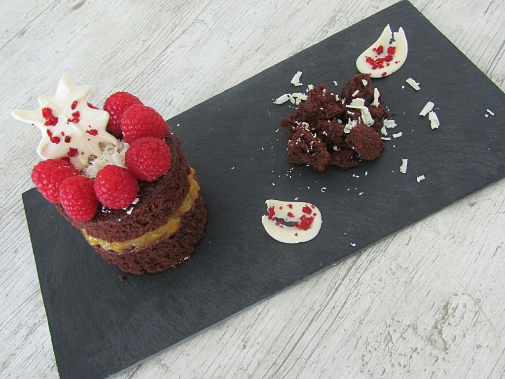Con lo que me gustan los bizcochos no sé cómo no he preparado antes uno de chocolate, he tardado demasiado en descubrirlo, pero ahora que sé la receta, repetiré seguro. La masa lleva cacao y le he añadido unos trocitos de chocolate negro para que tenga tropezones; la próxima vez lo haré con trozos de chocolate blanco, para probar otra combinación. Queda muy esponjoso y sabroso y uno de los trucos es añadirle un poco de agua caliente tras incorporar el cacao a la mezcla, así le aporta melosidad y no se queda seco. Otro truco es batir bien los huevos al principio con unas varillas eléctricas hasta que dupliquen su volumen y queden espumosos y luego a medida que vamos añadiendo ingredientes, seguimos batiendo. No le hace falta nada más, ya que está buenísimo el bizcocho solo, pero se puede decorar con mermelada o chocolate derretido. Esta vez lo he horneado en una bandeja alargada para cortarlos después con un molde redondo y he hecho porciones individuales. Los he decorado de diferentes maneras: uno lo he dejado sin nada tal cuál, otra porción la he decorado con chocolate blanco fundido por encima, luego he juntado dos porciones y les he añadido mermelada en el medio y por encima lo he decorado con frambuesas y chocolate blanco. También he preparado decoraciones de chocolate con trocitos de fresas liofilizadas, que he dejado enfriar previamente y le dan un toque de color al postre. El resultado, espectacular.