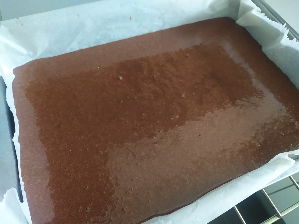 -calentamos el agua y la incorporamos a la preparación para que el cacao se acabe de integrar y diluir bien, también le aportará esponjosidad al bizcocho