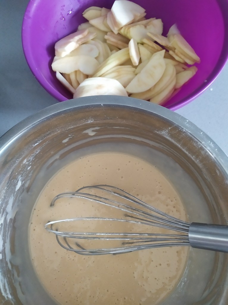 -mezclamos bien la masa y añadimos las manzanas que tenemos troceadas (reservamos unas pocas para colocar por encima de la tarta)