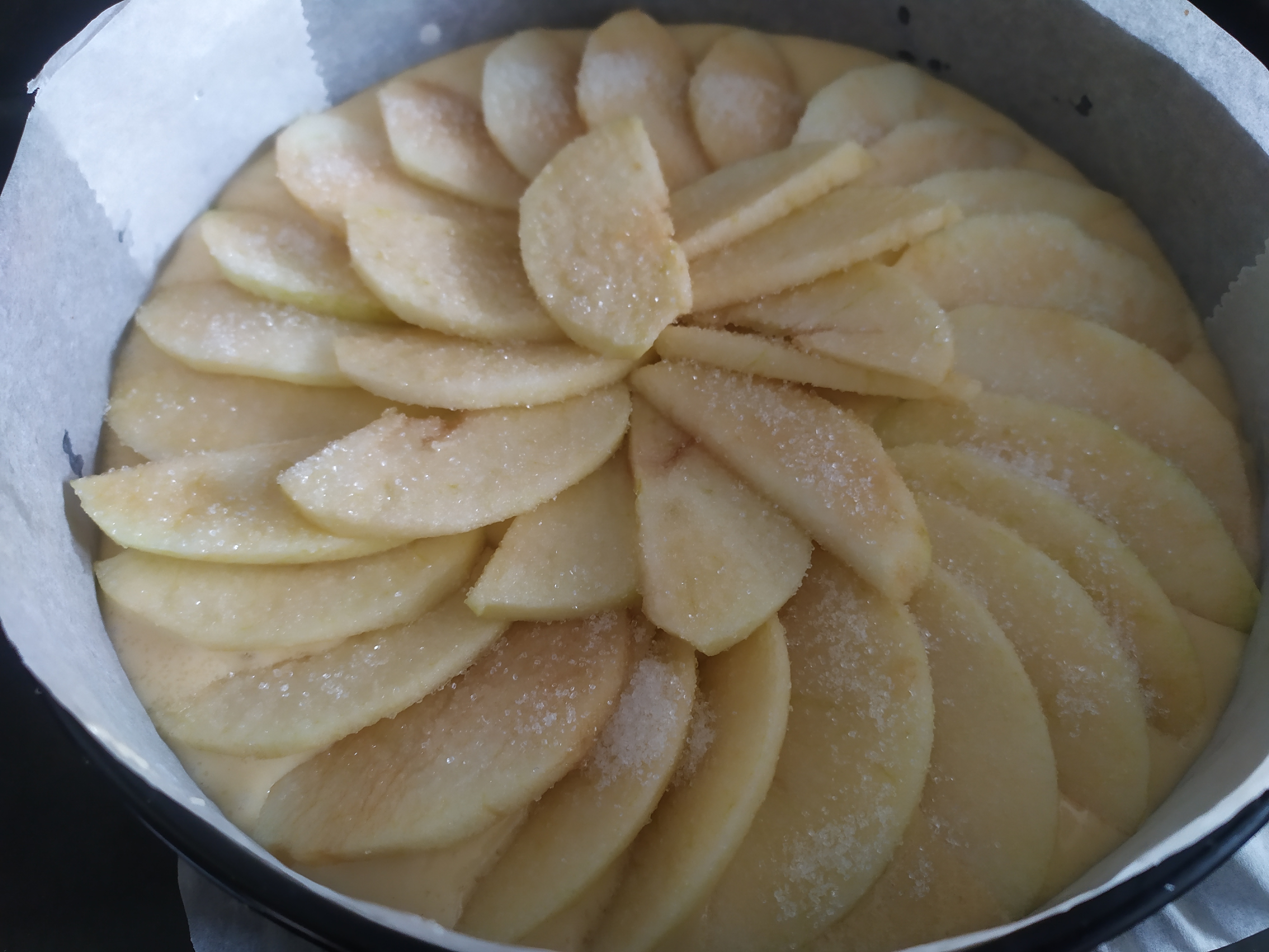 -colocamos por encima las láminas de manzana que habíamos reservado y espolvoreamos un poco de azúcar por encima