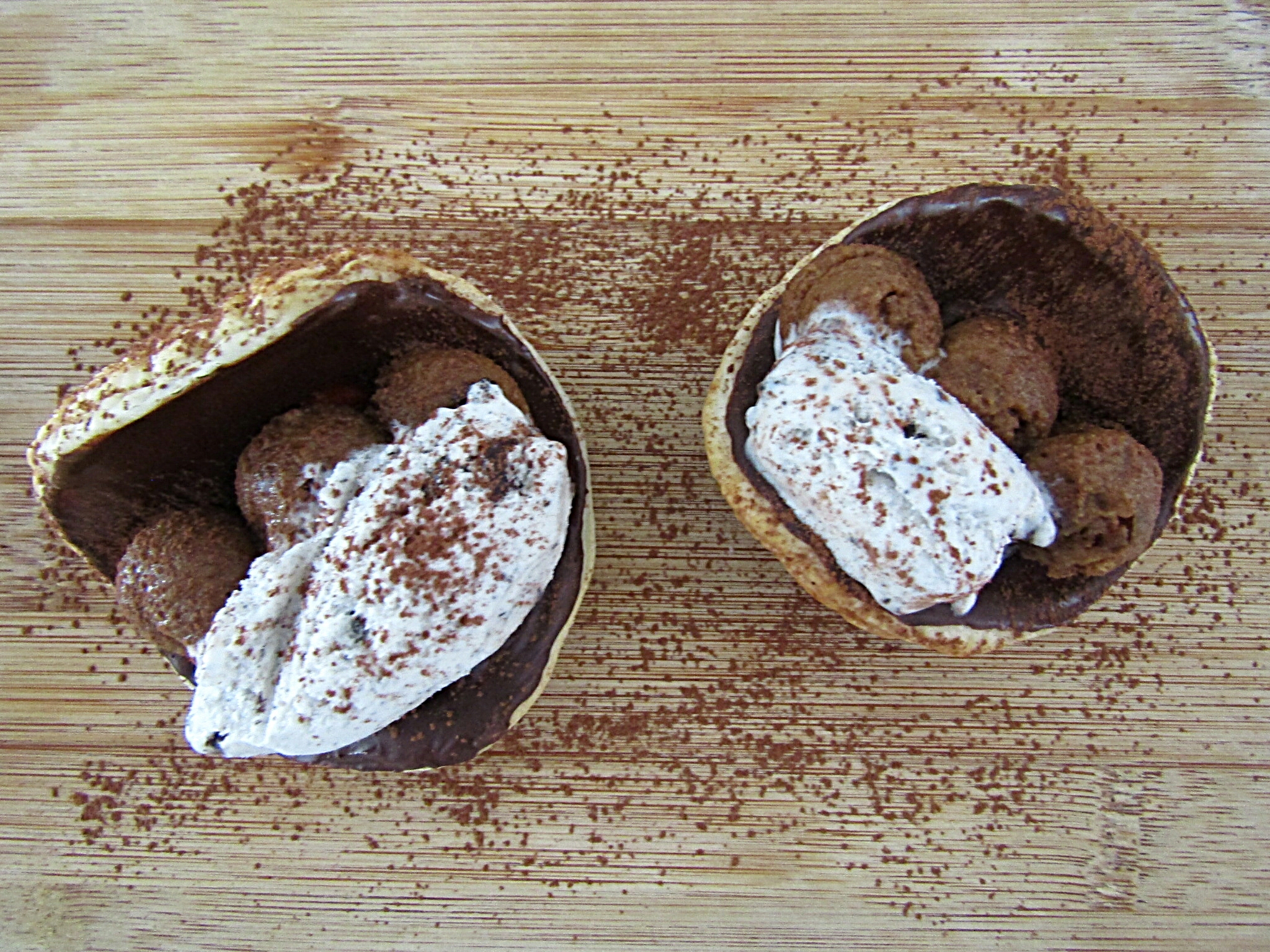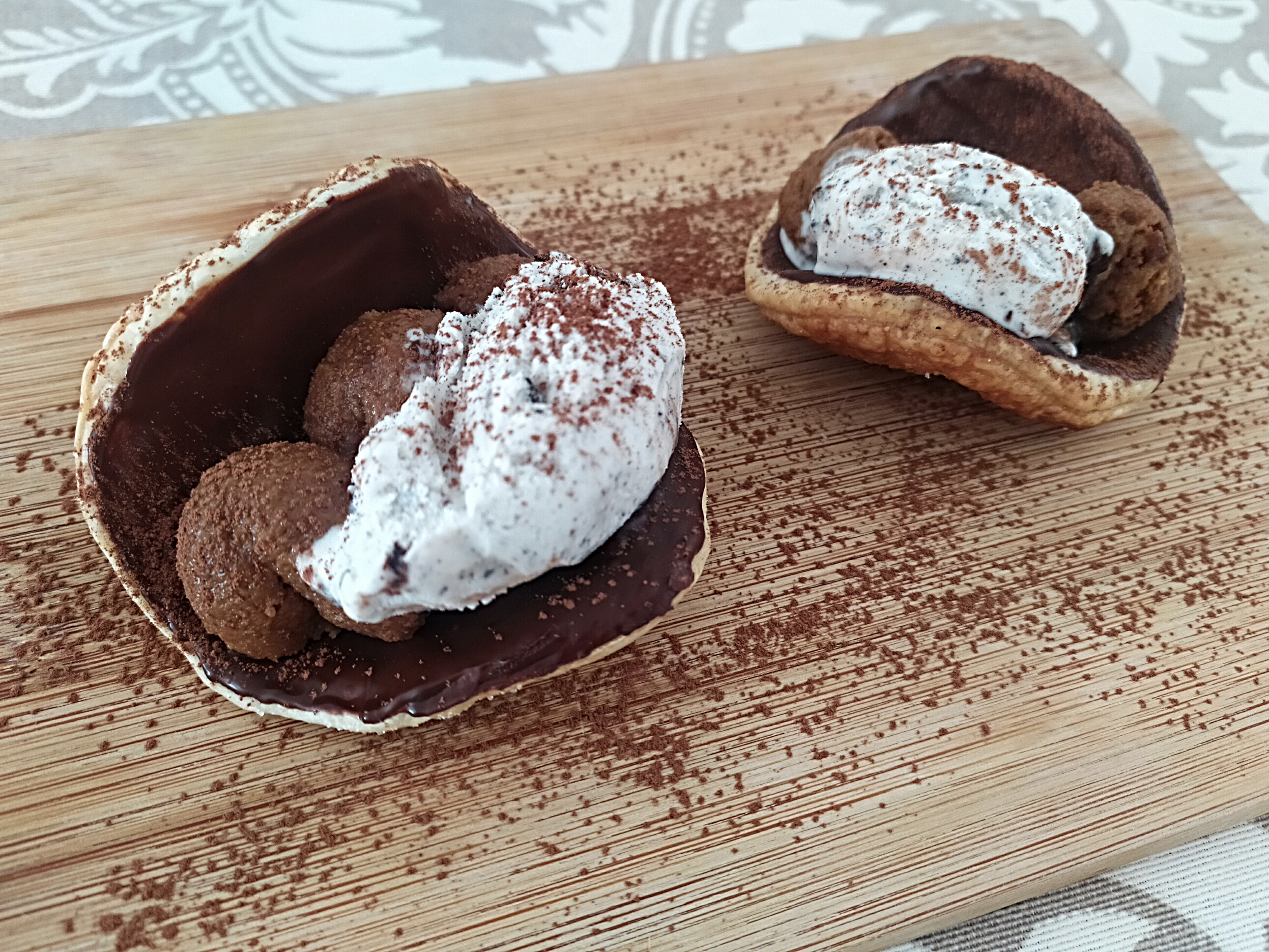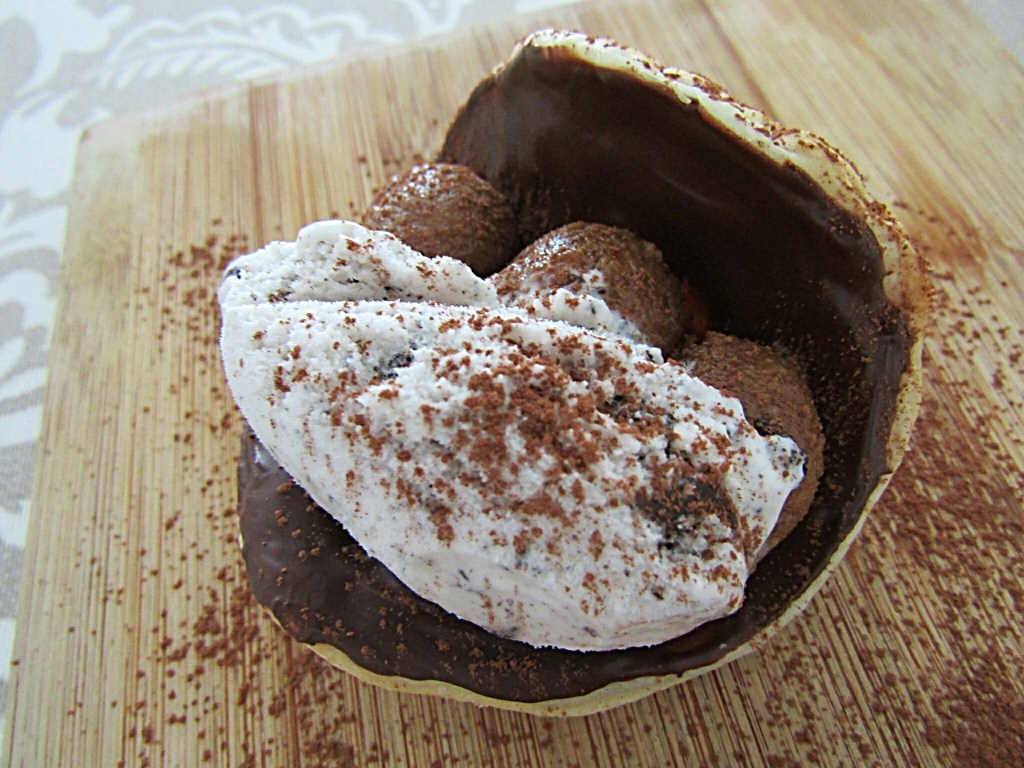 -a la hora de servir, rellenamos nuestras tejas con la mezcla de café y galletas y añadimos una bola de helado. Por encima le podemos espolvorear un poco de cacao