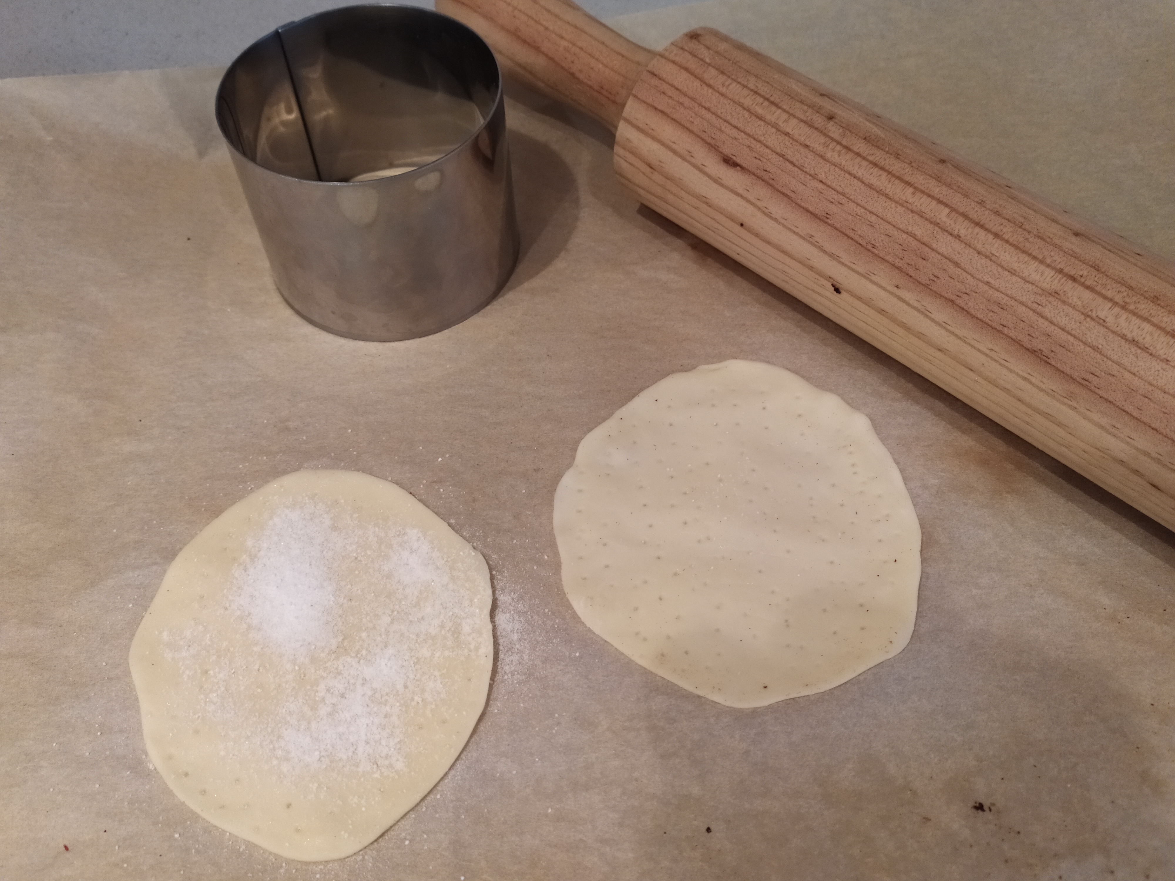 -cortamos la masa de hojadre con la ayuda de un cortador en forma circular. Las chafamos un poco con la ayuda de un rodillo