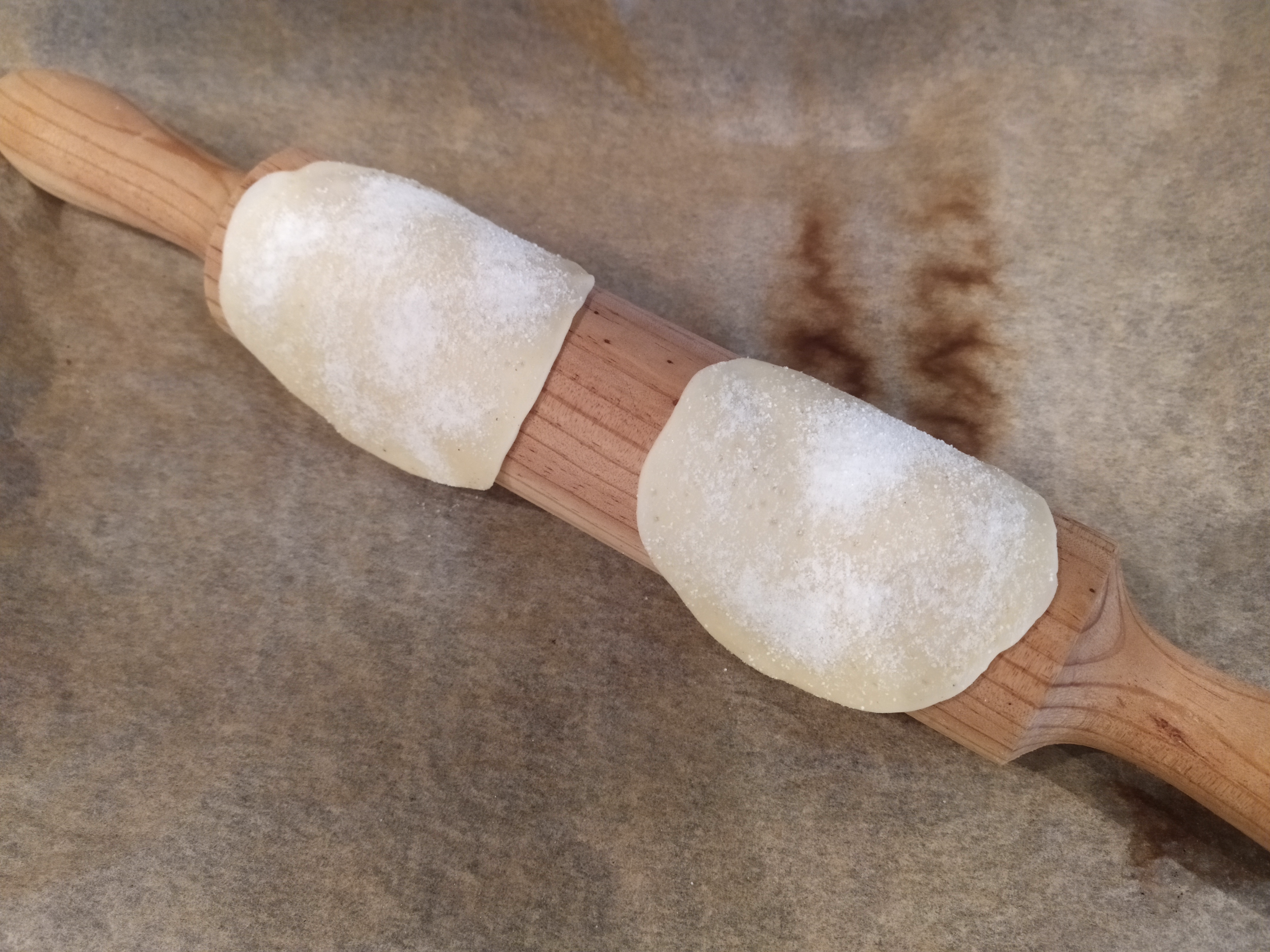 -colocamos dos círculos en un rodillo de madera (que se puede calentar en el horno) para que cojan forma y horneamos a 180 grados durante 15 minutos