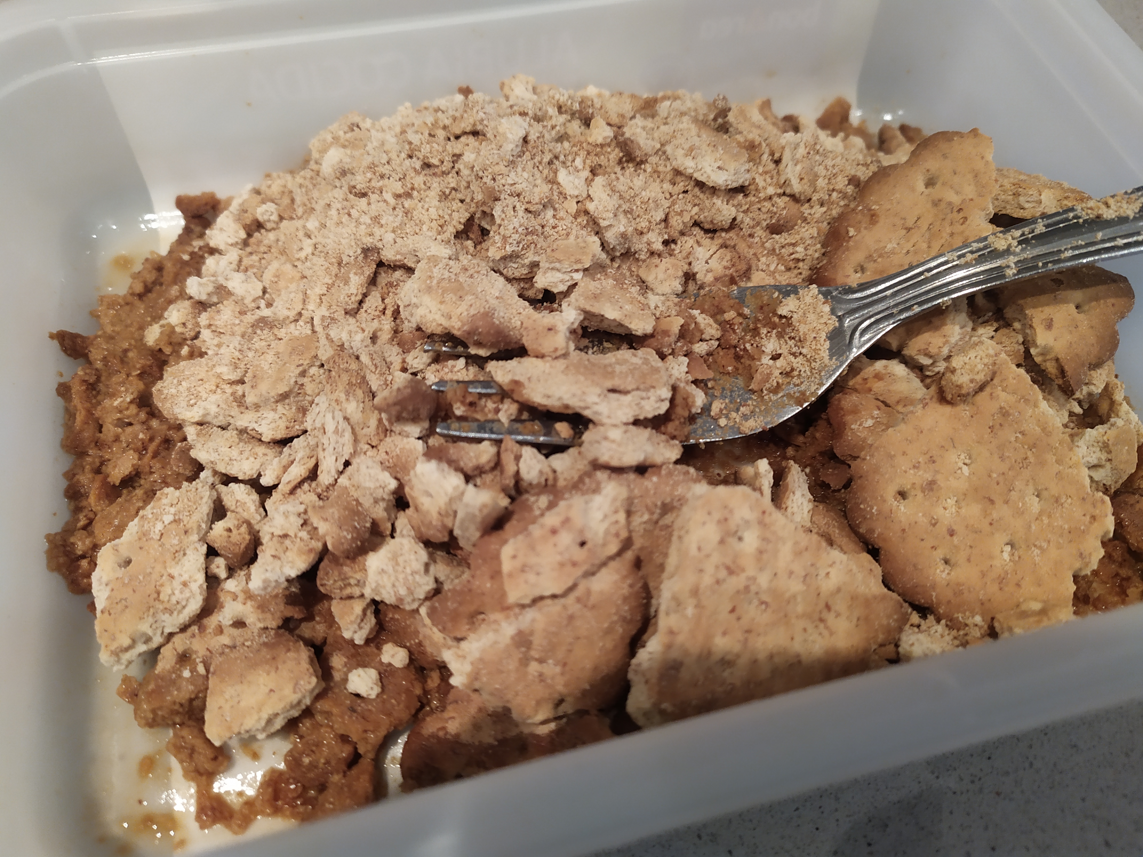 -mientras las tejas se hornean, preparamos el relleno de café y galletas. Para ello, picamos las galletas y mezclamos con el café templado, para que empapen